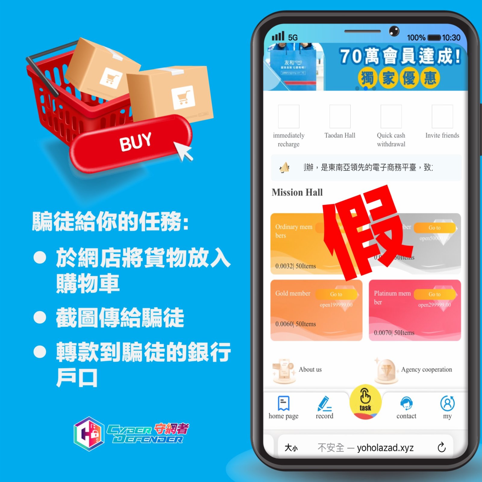 警方指出,騙徒會假冒不同平台,透過發布帖文或發放短訊,聲稱招聘「跟單助理」、「落單員」、「點讚評論員」等 ; 又聲稱「在家工作、無需經驗、即日出糧、歡迎在職人士」,要求應徵者假扮買貨,把指定貨品加入平台購物車及將相關金額存入騙徒指定的銀行戶口。當應徵者再次存入大額貨款後,騙徒便會用不同藉口拒絕歸還本金,令應徴者血本無歸。