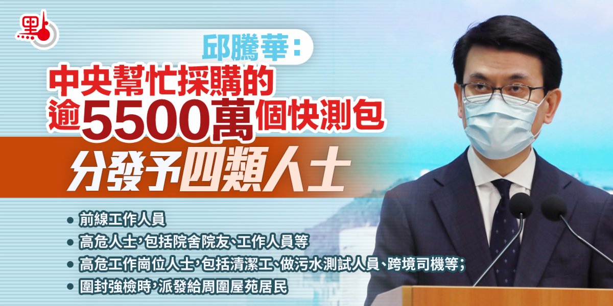 邱騰華說,分發對象有四類,第一就是前線工作人員;第二是高危人士,包括院舍院友、工作人員;第三是高危工作崗位人士,包括清潔工、做污水測試人員、物業管理人員、跨境司機等;第四是圍封強檢時,派發給周圍屋苑的居民。