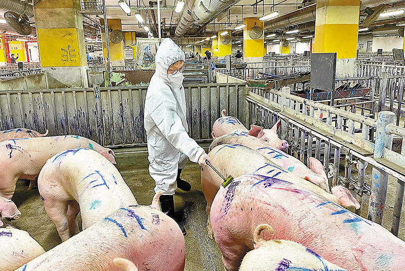 香港文匯報訊(記者 盧靜怡 廣州報道)12日早上八時許,滿載供港活豬的藍色貨運車駛入香港上水屠房。粵海廣南行肉食部經理江森輝穿上白色防護服,腳套黑色水靴,和身邊的團隊員工一起來到運豬車後方,準備卸豬。一頭成年活豬平均體重有250多斤,理貨員將活豬從車上經卸豬台和趕豬通道趕到待拍賣的豬欄。「因為香港疫情很嚴重,人手不夠,哪個崗位缺人,大家都會自覺頂上。不論之前是文職還是司機或管理層,都會到屠房幫手。」