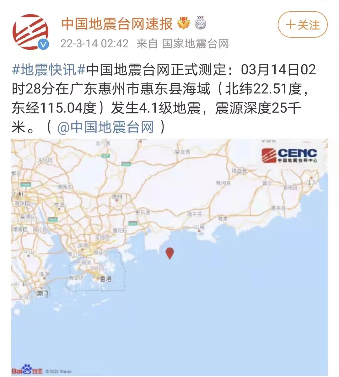 據中國地震台網正式測定,3月14日2時28分,在廣東惠州市惠東縣海域(北緯22.51度,東經115.04度)發生4.1級地震,震源深度25千米。香港地區有震感,多位市民表示感到住宅樓樓體及室內物品有明顯震動及晃動,震動時間持續數秒。