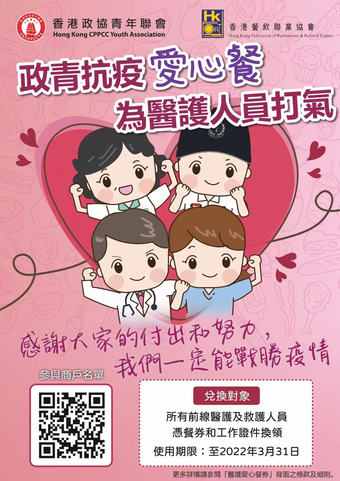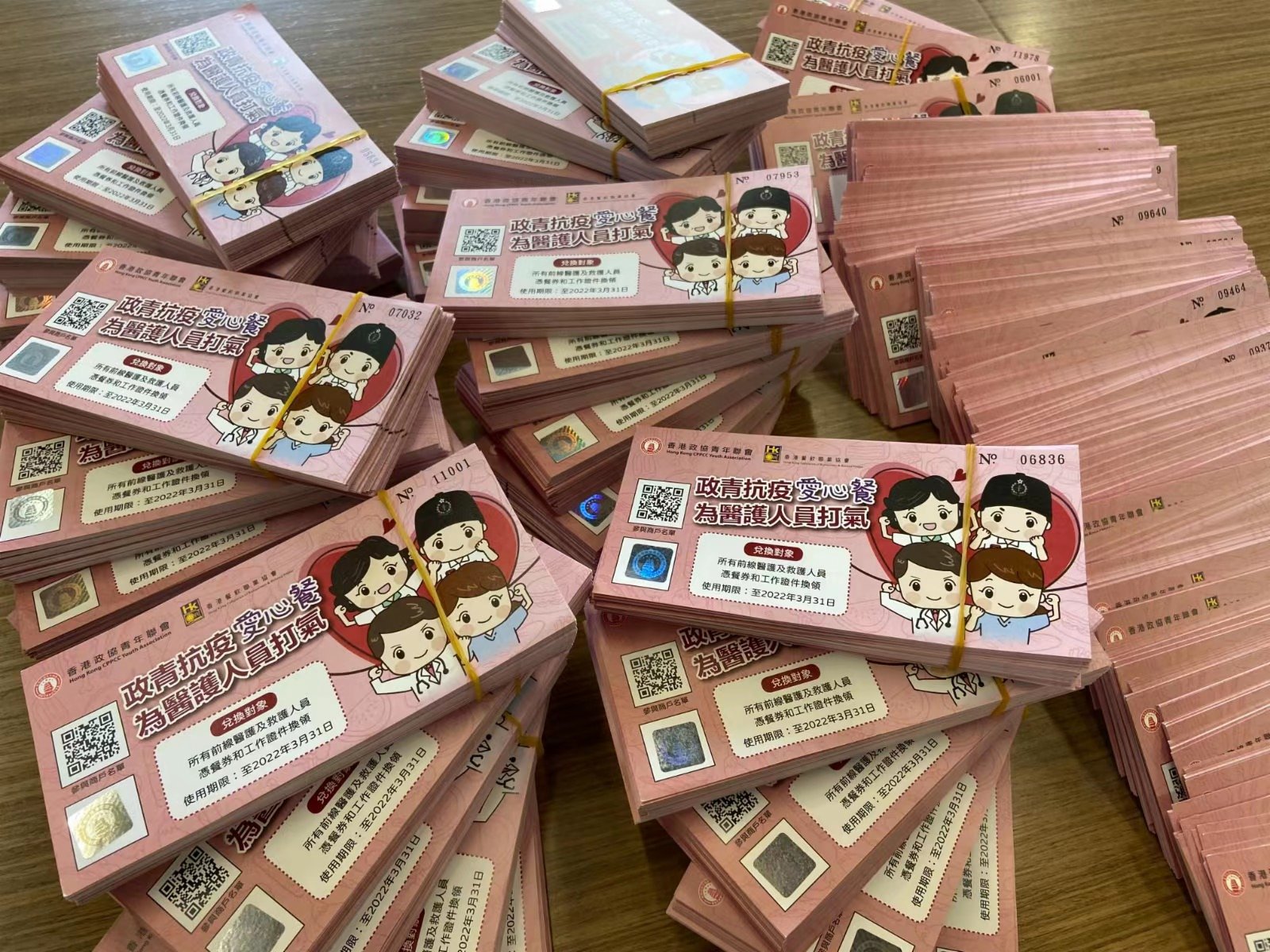 餐券目前正在派發階段,希望在不增加政府和醫院行政壓力的情況下,通過多種渠道,向醫院、疫苗注射站等人員發放。憑餐券及相關證件,前線人員可於全港81個地區275間食肆免費享用特設的愛心餐飲。