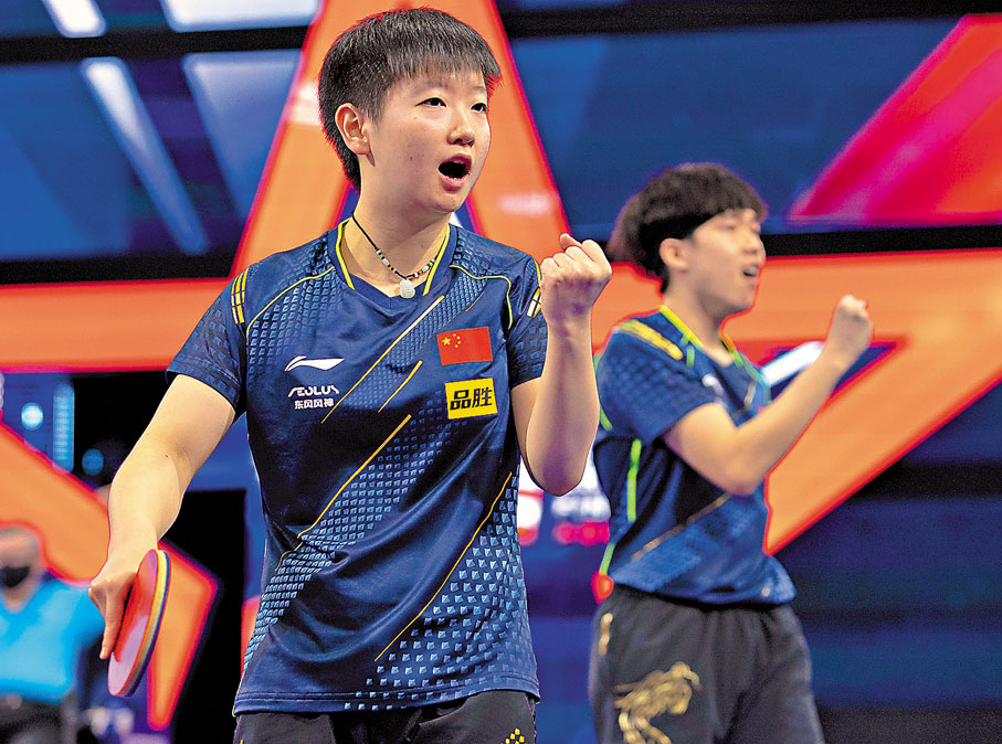 世界乒乓球職業大聯盟(WTT)新加坡大滿貫賽事當地時間16日晚產生首項冠軍。在混雙項目決賽中,中國組合王楚欽/孫穎莎(圖)直落三局擊敗中國台北組合林昀儒/鄭怡靜,奪得混雙冠軍。而當天進行的單打比賽,老將許昕苦戰5局,不敵德國選手弗朗西斯卡,無緣晉級,另外三位男隊成員樊振東、馬龍、梁靖崑此前一天已晉級8強。女單方面,孫穎莎在國乒隊內較量中以3:0戰勝劉詩雯,攜手隊友王曼昱、王藝迪、陳夢闖入8強。 ◆中新社