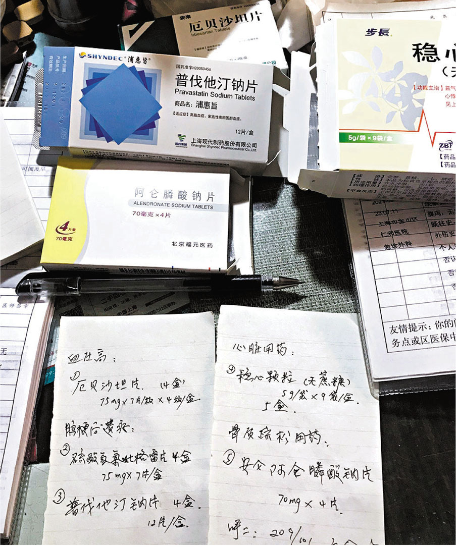 「心臟病藥,高血壓藥,骨質疏鬆藥,腦梗後遺症藥,張家阿姨,你需要的藥全在這個袋子裏,找零的錢都給你放在病歷卡裏了哦。」深夜,一名志願者身背十幾個袋子,一路小跑地來到一戶居民家,將其中一個裝有10多盒藥的袋子遞給一位居民。