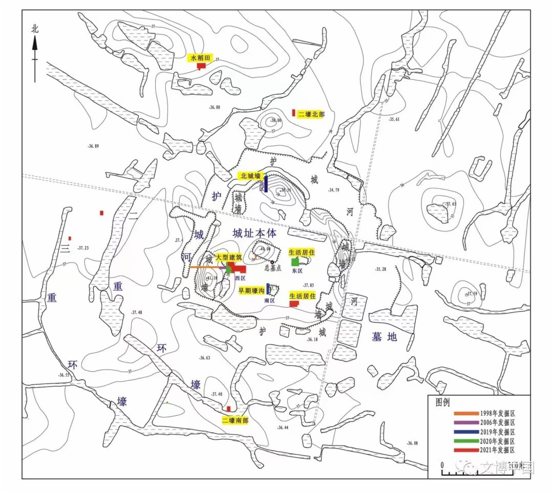 雞叫城形成了由城址本體、城外聚落遺址、外圍環壕以及平行水渠和稻田片區所組成的城壕聚落集群。考古發掘顯示,「二環」以內有連續的文化層分布,「二環」以外基本上沒有文化層堆積,這成為專家判斷各個分區功能的主要依據。