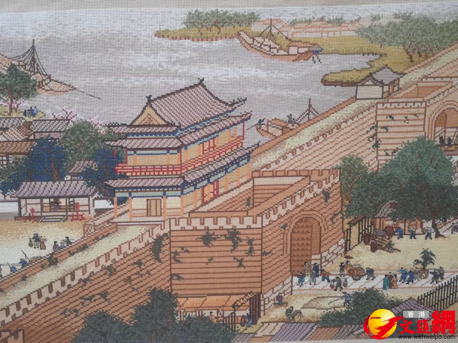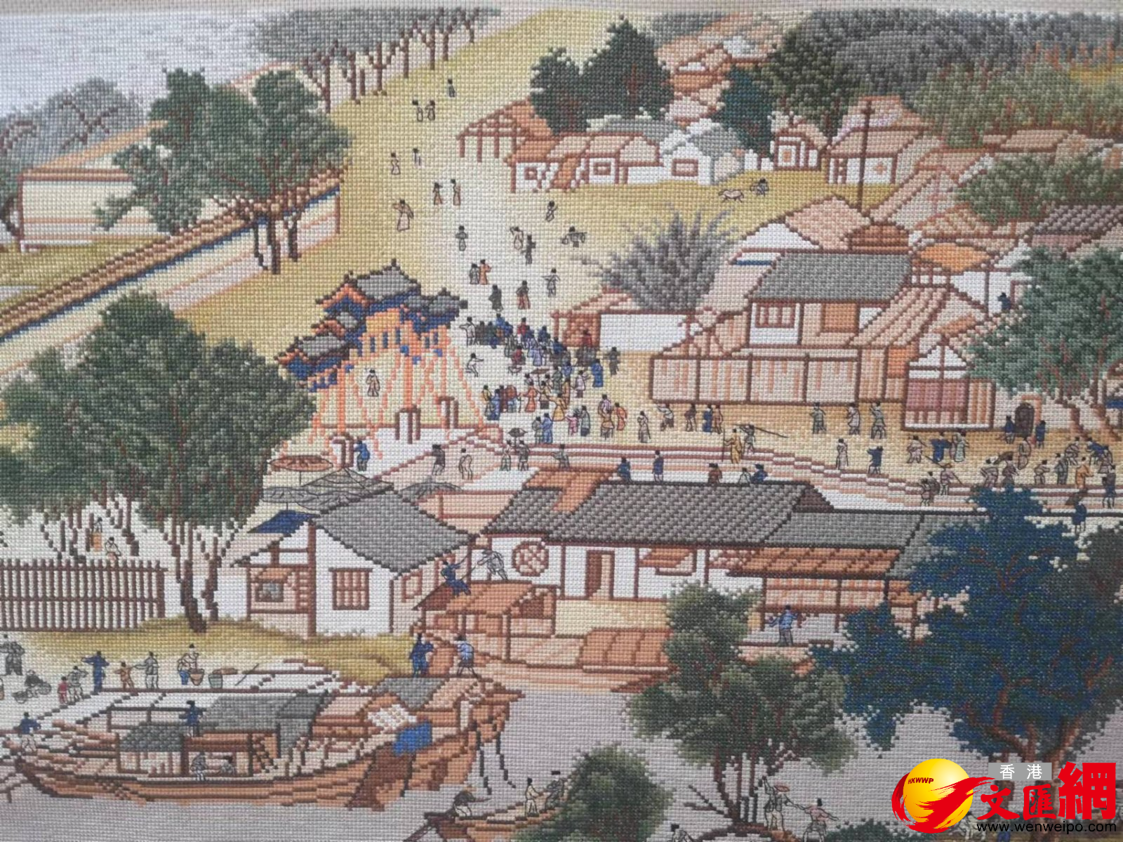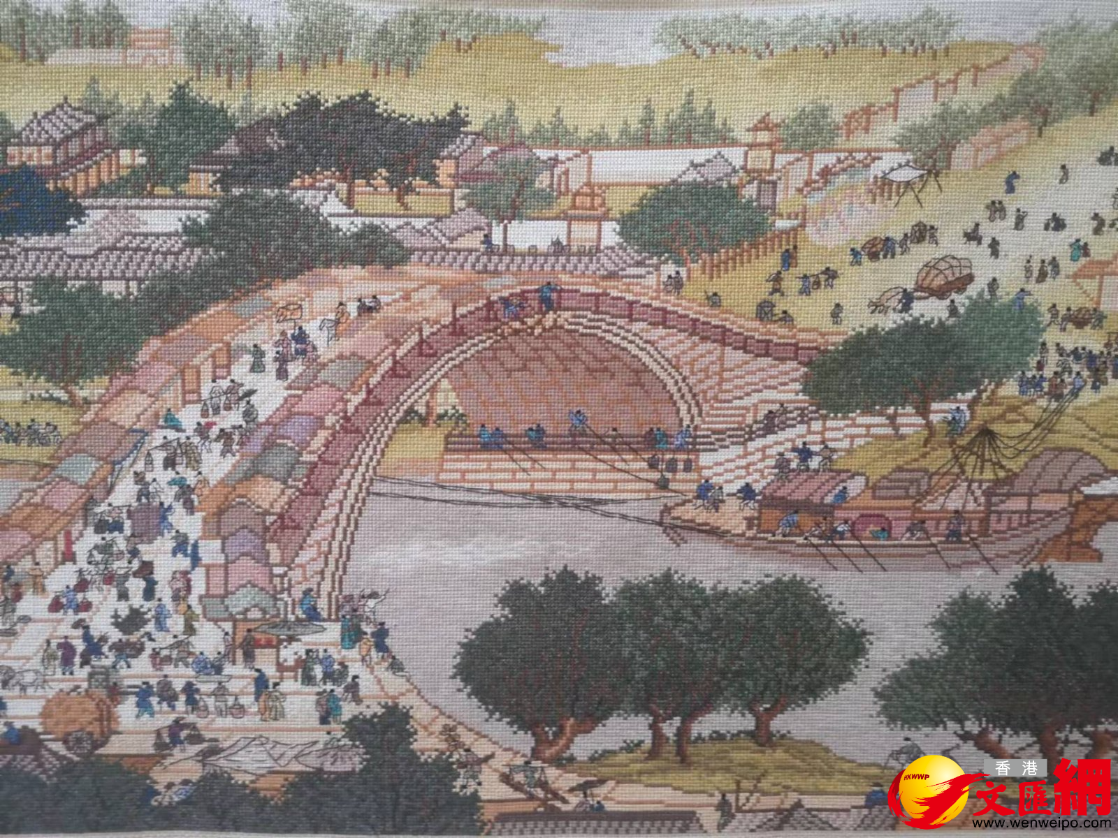 「您是怎麼堅持綉完這麼長一幅《清明上河圖》的,真是太厲害了!」說話間,王俊蘭從箱底將《清明上河圖》全景圖十字綉取出。眼前,一幅長22米、寬約0.8米的《清明上河圖》十字綉緩緩展開,畫面栩栩如生、惟妙惟肖,在場的人發出陣陣讚嘆聲。在20多米的畫卷裏,王俊蘭共綉了500多位人物,牛、騾、驢等牲畜數10匹,車、轎20多輛,大小船隻29艘,房屋、橋樑、城樓等各有特色,不僅完整再現了北宋畫家張擇端筆下的盛景,更體現了一名農村婦女9年的不懈堅持。