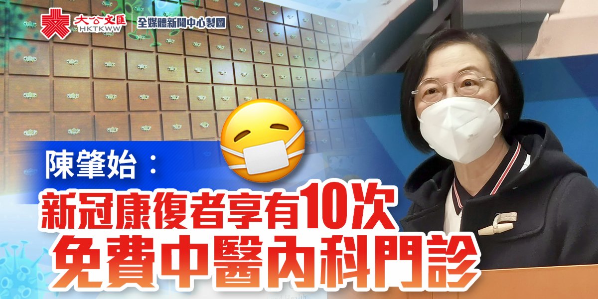 大公文匯全媒體報道:食物及衞生局局長陳肇始今日(3日)出席政府例行抗疫記者會指,新冠康復人士離開隔離設施或出院後,可以接受全港18間中醫診所暨教研中心提供中醫門診特別診療服務,讓他們出院或完成隔離後6個月內,享有最多10次免費中醫內科門診,協助盡快康復。