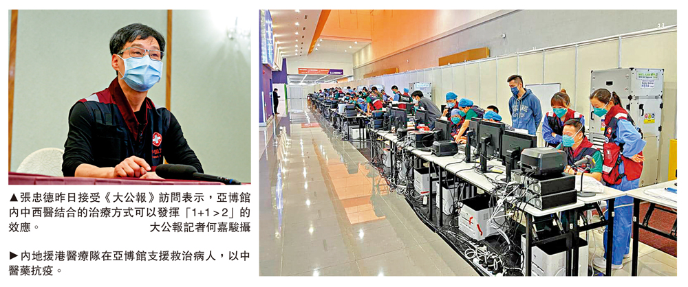 張忠德昨日接受《大公報》訪問時表示,兩地醫護配合默契,分別運用中西醫各自的優勢為病人提供治療,發揮「一加一大於二」的效應,在改善輕症患者臨床症狀,緩解重症病人身體不適等方面立竿見影。他希望特區政府經過這次經驗,鼓勵將中醫藥應用於更多疾病救治,讓中醫在香港的醫療系統中扮演更重要的角色。