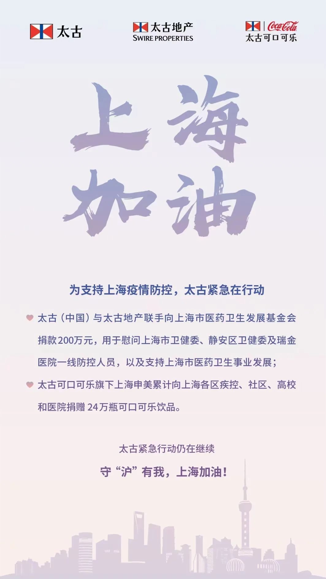 太古可口可樂旗下上海申美累計向上海各區疾控、社區、高校和醫院捐贈24萬瓶可口可樂飲品。太古(中國)和太古地產深耕上海多年,希望能通過本次捐贈盡綿薄之力,積極踐行企業擔當,表達對堅守在前線的醫護人員和工作人員的感激,支持上海市的抗疫工作。