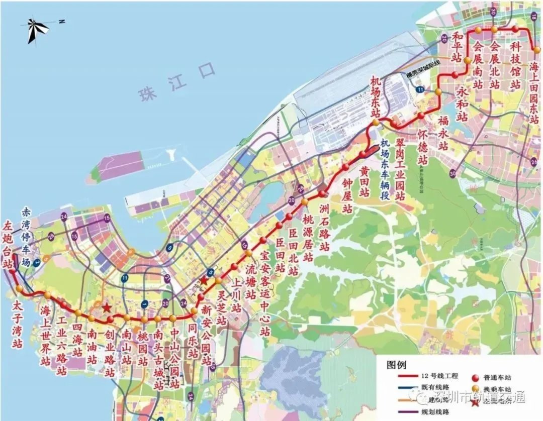 地鐵12號線起自南山區左炮台站,自南向北穿越南山中心區、寶安中心區、福永片區、大空港及會展片區後,終至寶安區海上田園東站,是支撐深圳西部發展軸的軌道交通骨幹線。線路全長約40.6 km,全線採用地下敷設方式;共設站33座(其中換乘站18座)。全線圍護結構已完成100%;車站主體結構已完成100% ;盾構區間已完成 100%;其中27座車站已全部封頂;52個盾構區間全部貫通;附屬結構已開工202個,全線已軌通。