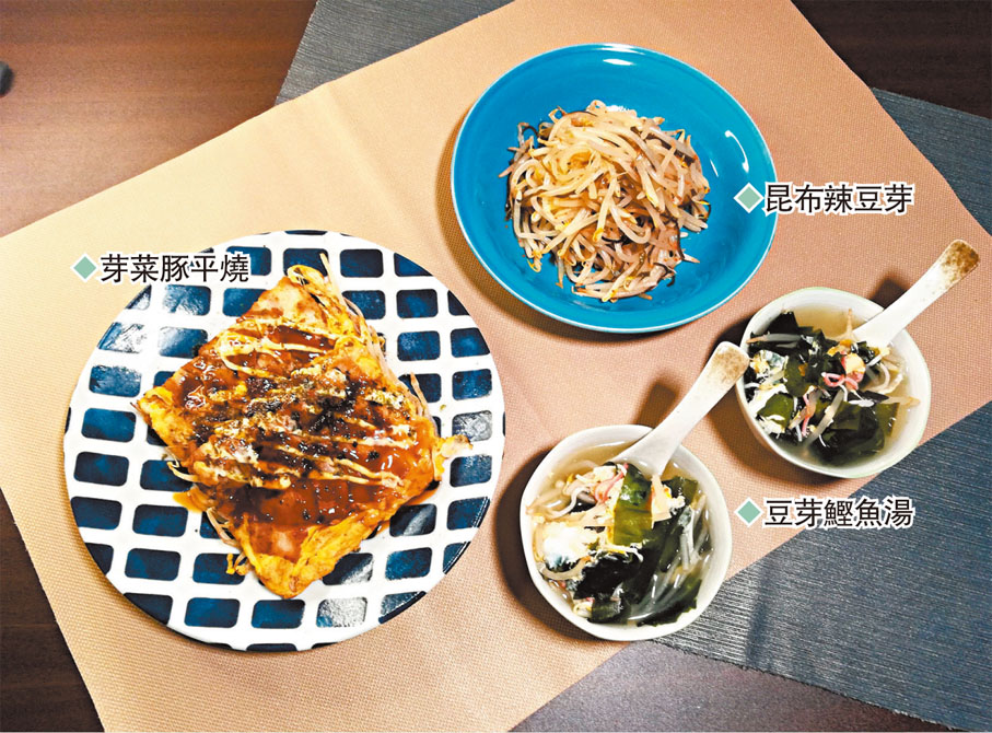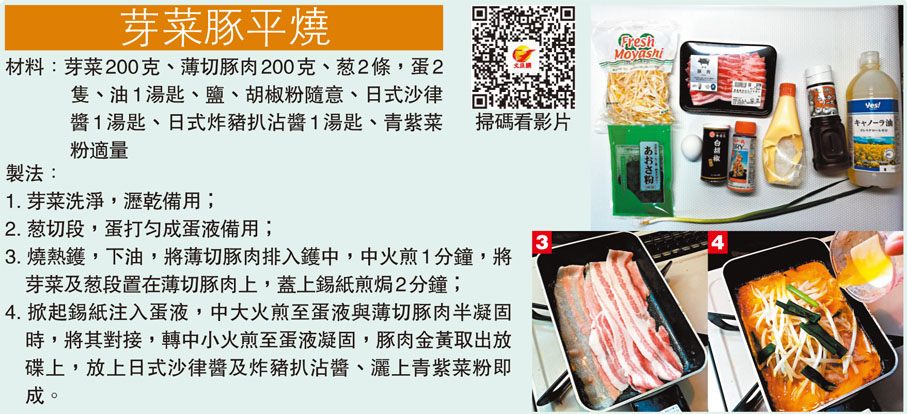 材料︰芽菜200克、薄切豚肉200克、葱2條,蛋2隻、油1湯匙、鹽、胡椒粉隨意、日式沙律醬1湯匙、日式炸豬扒沾醬1湯匙、青紫菜粉適量