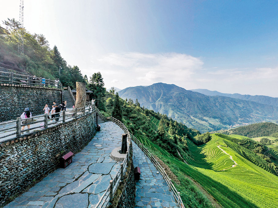 例如,在廣西龍勝各族自治縣龍脊鎮平安村,是聞名全國「龍脊梯田」所在地,景區面積共66平方公里,梯田海拔最高880米,最低380米,垂直高差500米,全部的梯田分布在海拔300至1100米之間,最大坡度達50度,一層層從山腳盤繞到山頂,層層疊疊,高低錯落,其線條行雲流水,其規模磅礴壯觀,被稱為「龍脊梯田」。