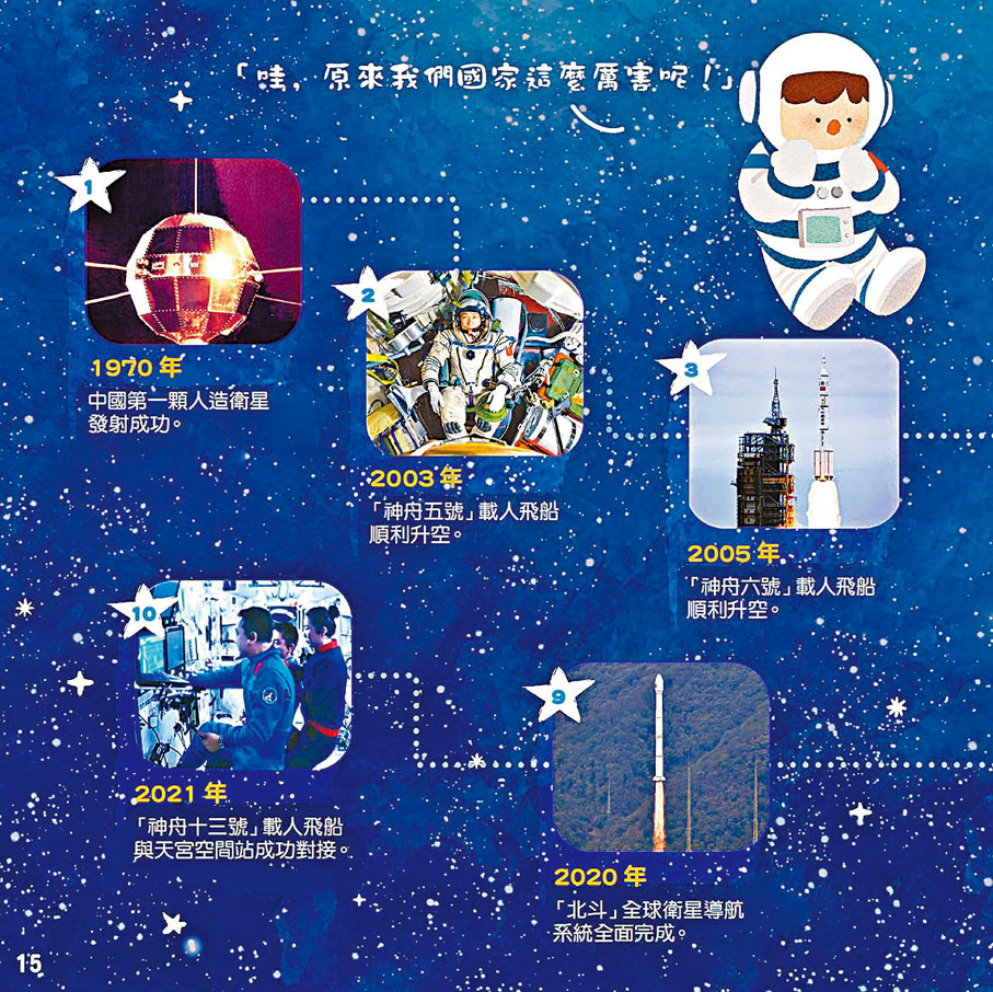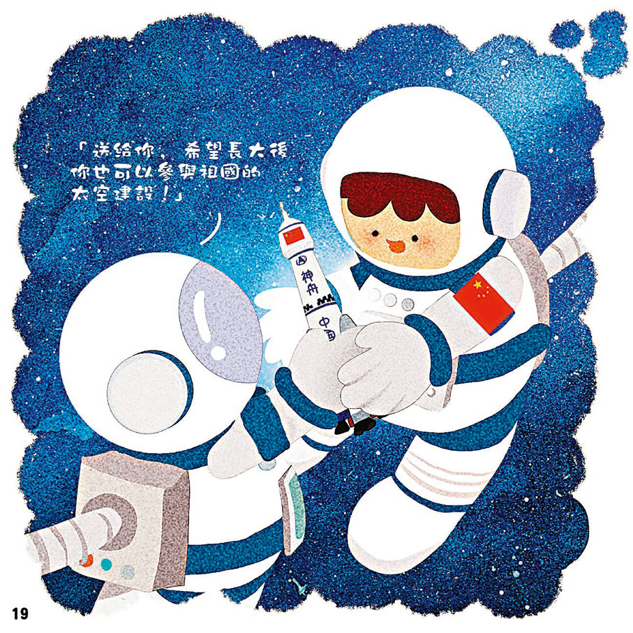 在繪本中,航天員向安安展示了祖國自1970年成功發射第一顆人造衛星,2003年「神舟五號」載人飛船順利升空,至2021年「神舟十三號」載人飛船與「天宮」空間站成功對接以來,幾代人努力不懈的成果。之後,航天員又向安安介紹了香港特區在參與祖國太空科研的貢獻,例如香港理工大學參與研製的相機系統和樣本採集裝置。這些都使安安不禁讚嘆:「天上的『星星』真的不簡單!」繪本藉此帶出維護包括太空安全在內的國家安全之重要性。