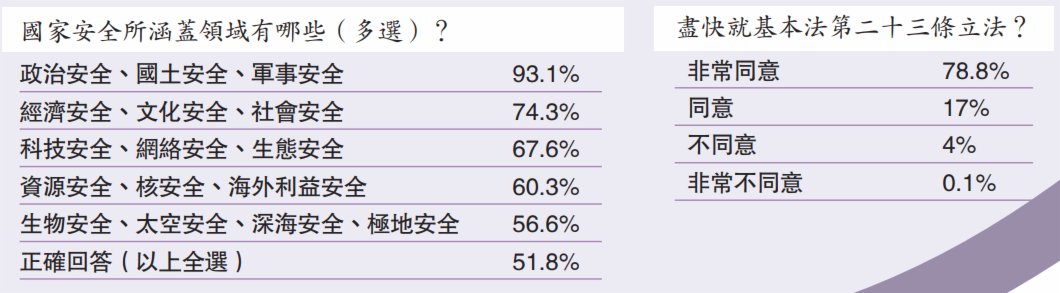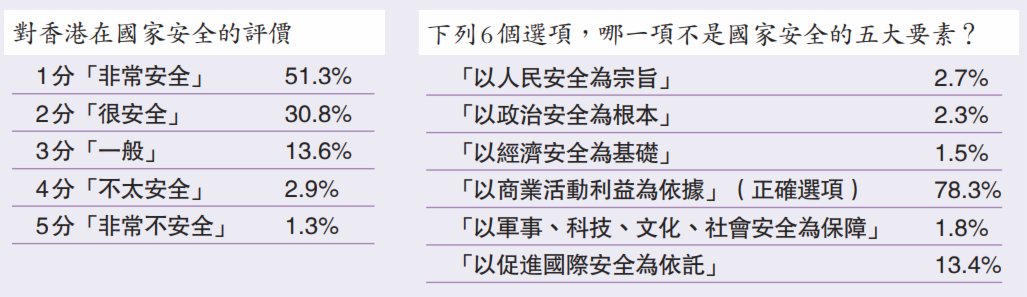 是次調查於4月11日至13日進行,共訪問953名香港市民。結果顯示,逾八成受訪者對香港在國家安全的評價為「非常安全」和「很安全」,另有逾九成半受訪者「非常同意」及「同意」盡快就基本法第二十三條立法。