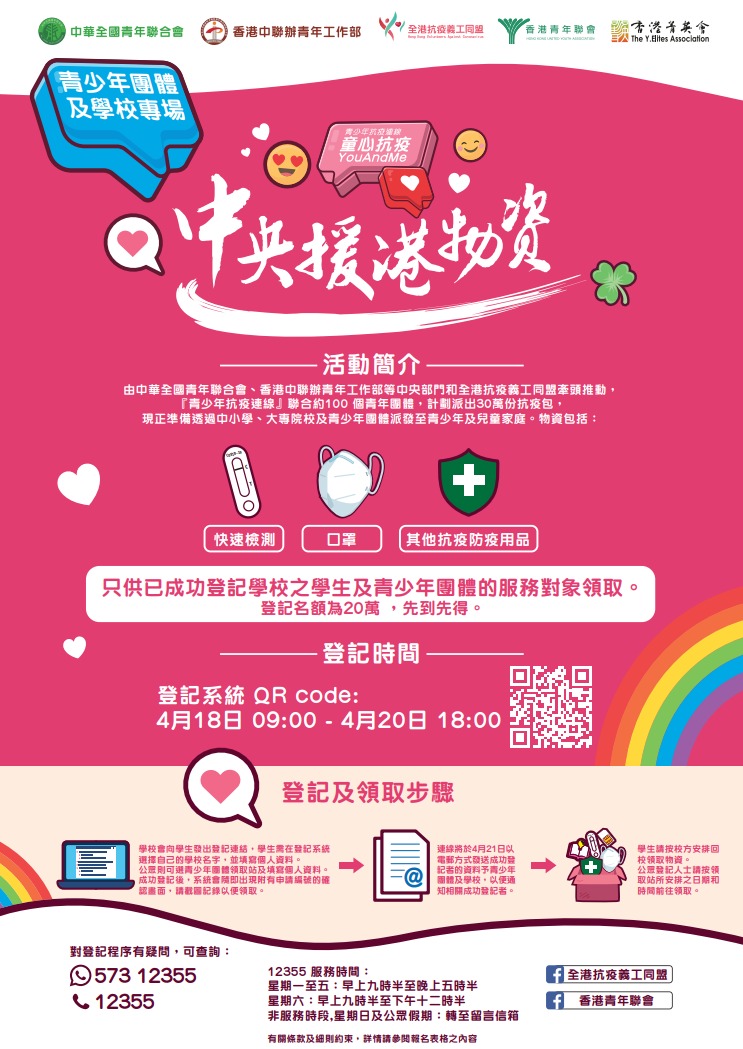 大公文匯全媒體報道:由中華全國青年聯合會、香港中聯辦青年工作部等中央部門和全港抗疫義工同盟牽頭推動募集,多家本港和內地機構捐款及捐助物資,香港青年聯會聯同近100個團體成立「青少年抗疫連線」,合作推動活動「中央援港-童心抗疫YouAndMe」,將價值超過1.5億的中央援港物資派發給基層青少年及兒童家庭。活動目標派出30萬份中央援港物資包,已通過不同青年團體、學校及機構派發給青少年及兒童家庭。