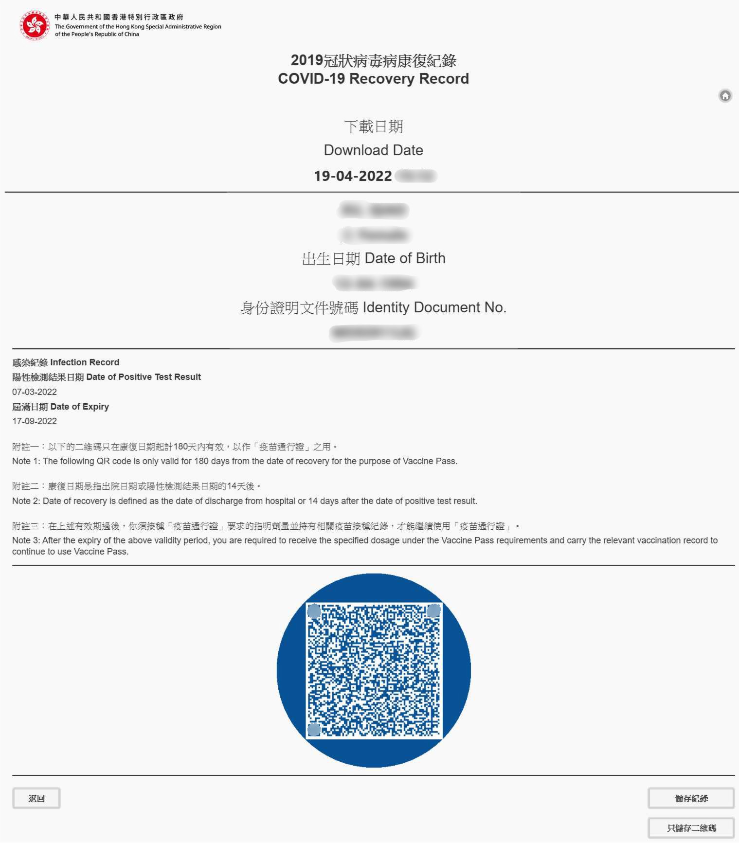 提交資料後,系統將生成新冠病毒康復紀錄。使用者可按右下角的按鈕,選擇下載完整的電子康復記錄,亦可只儲存二維碼至相關設備中。注意,此二維碼只在康復日期起計180天內有效。