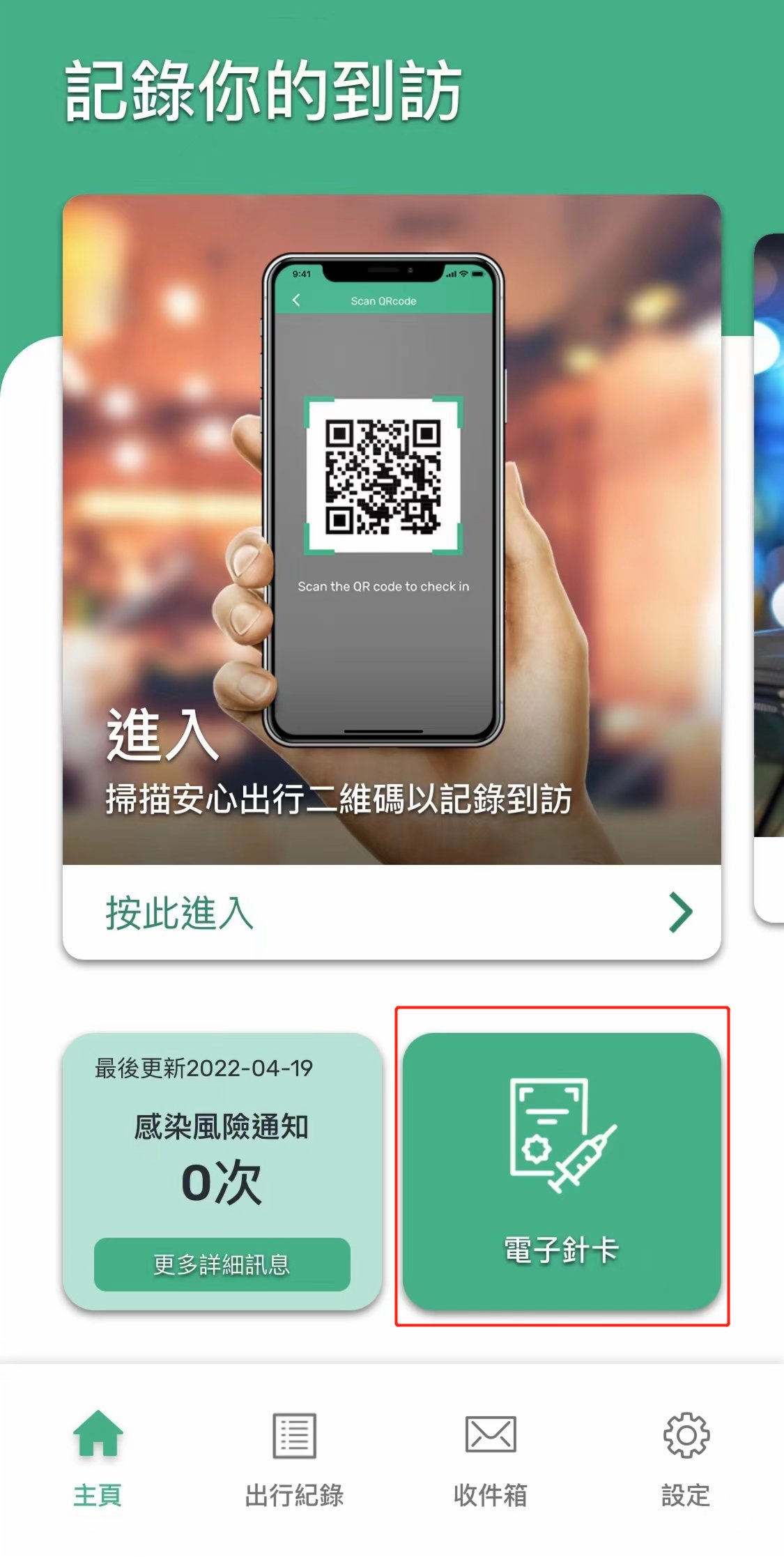 更新後,使用者應選擇右下方的「電子針卡」,再點擊「康復記錄」,切換到加入康復記錄二維碼界面。
