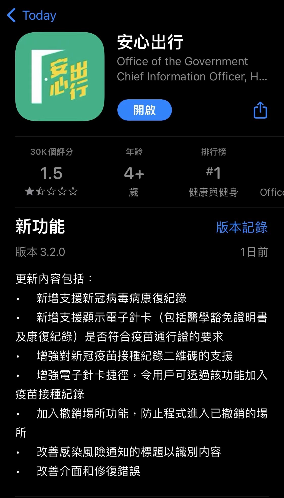 新版本新增支援新冠病毒病康復記錄,並支援顯示「電子針卡」(包括醫學豁免證明書及康復記錄)是否符合「疫苗通行證」的要求,同時加入撤銷場所功能,防止程式進入已撤銷的場所。