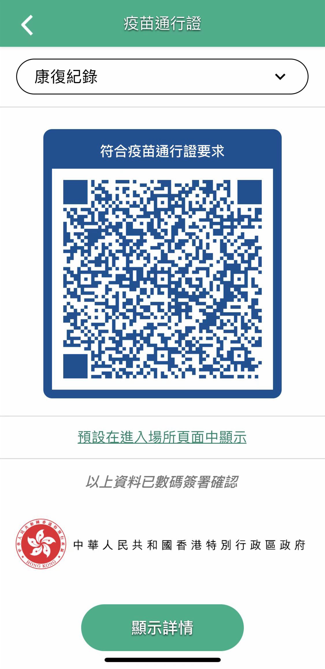 完成將康復紀錄二維碼加入「安心出行」後,使用者可預設將此二維碼在進入場所頁面中顯示,以取代「電子針卡」二維碼。需要留意,如康復紀錄二維碼已不符合「疫苗通行證」接種要求,其外框會由藍色(符合)變為紅色(不符合)。