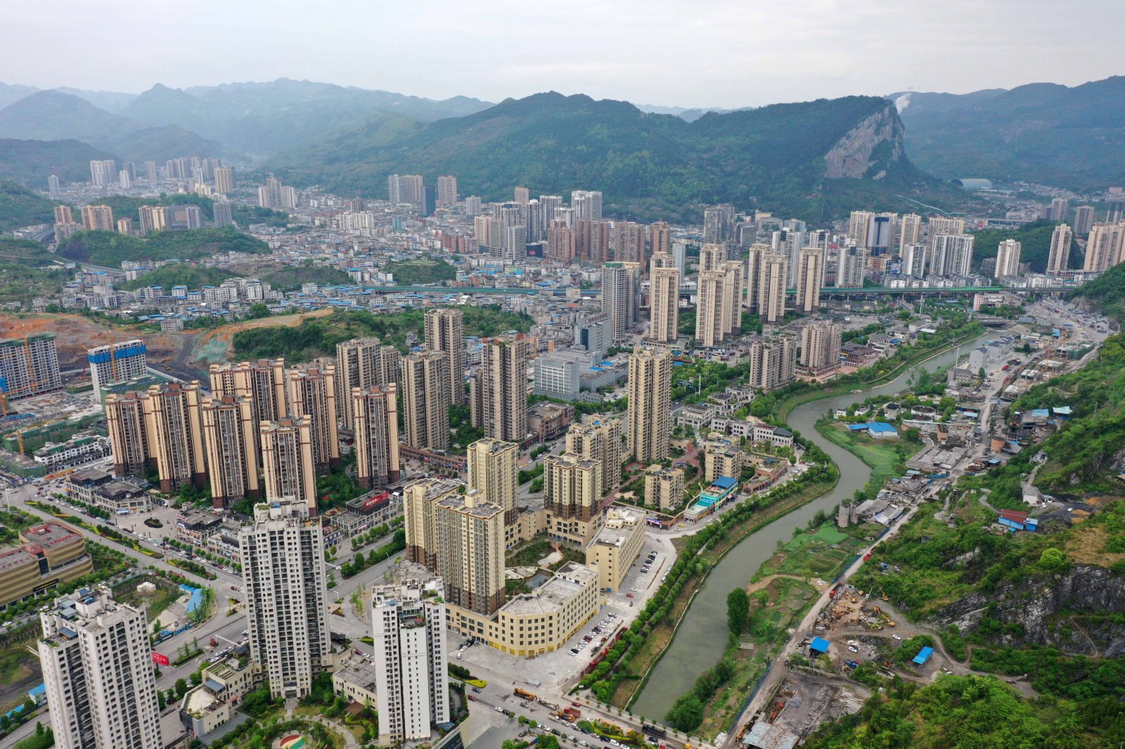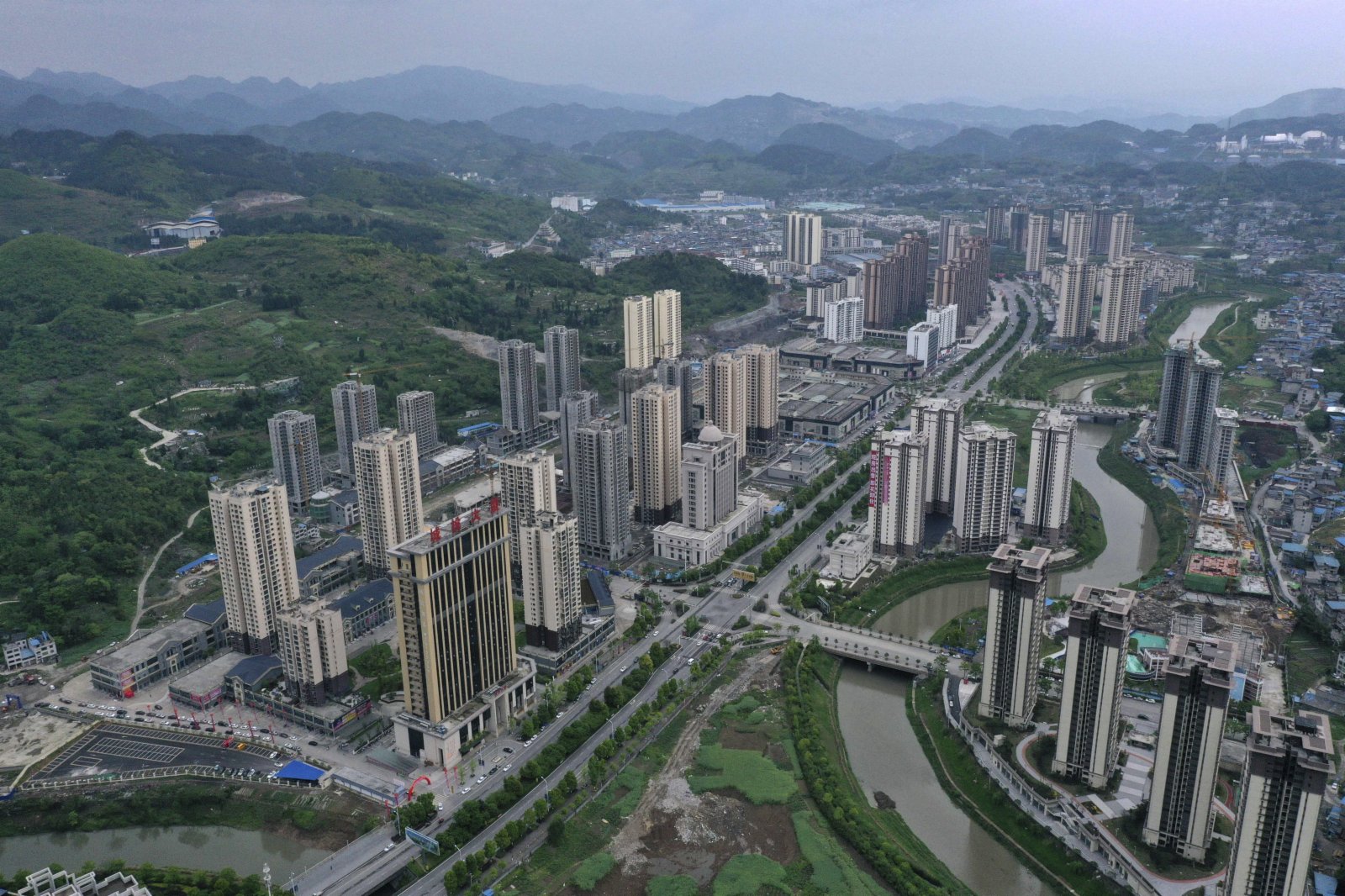 4月19日傍晚,春雨後的貴州省遵義市桐梓縣新城景美如畫,美不勝收(無人機照片)。新華社