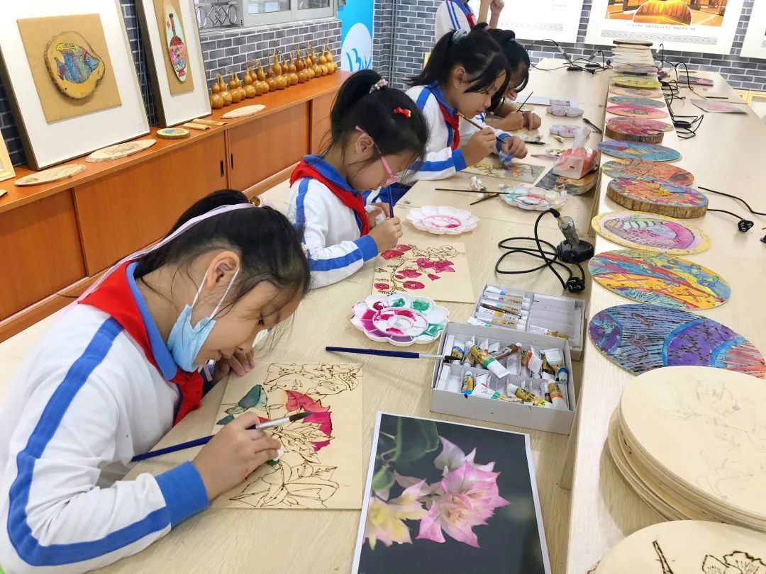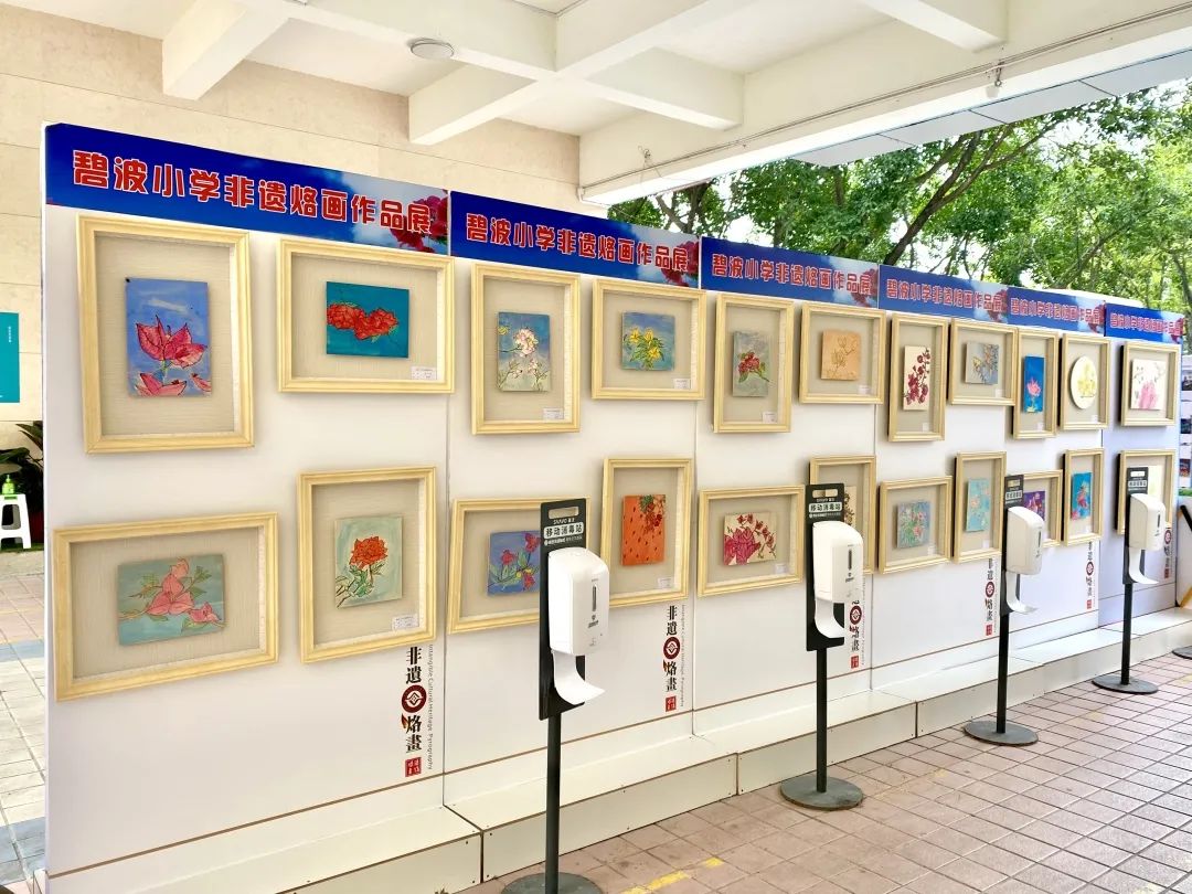 在位於羅湖的碧波小學,跨學科項目式課程正在各年級開展,民間美術資源(非遺)「烙畫」導入小學美術課程資源體系也經歷了一年多的實踐,學生在此過程中學習文化遺產知識,掌握文化傳承技能。上學期,學校以「走近簕杜鵑」這個具有深圳特色的主題為切入點,結合烙畫開展跨學科項目式研究活動。學生們在語文課上學習與簕杜鵑相關的詩歌,並製作科普手抄報;在科學課上觀察校內簕杜鵑的植物特徵,通過設計對比實驗了解簕杜鵑的生長習性;在英語課上,學會如何用英語向外國友人介紹「市花」簕杜鵑;在美術課上製作各式各樣的簕杜鵑手工藝品。通過傳統烙花技藝,學生們還創作了100餘幅簕杜鵑主題烙畫,作為學校2021藝術節暨社團成果匯報展(美術專場)在校園中庭開展。
