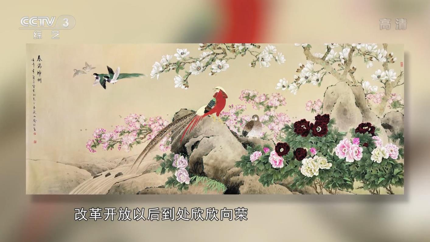 中國工筆花鳥畫家 喻繼高:我們改革開放了以後到處欣欣向榮。我就在構思一個春天的景象欣欣向榮,花香蜜蜂也來了,感覺到有香氣,陳老師的畫的特點是雙鉤填彩,雙鉤用線鉤下來再去着色,我用的技法基本上是雙鉤填彩法,你看雖然有線,但是它不突出線,還是突出畫整體。
