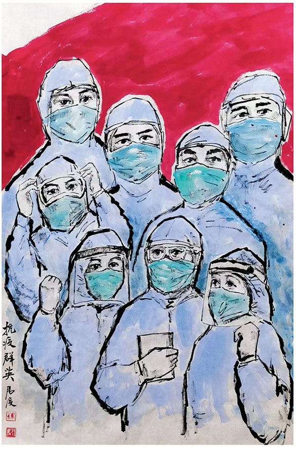 筆走龍蛇的草書「血濃於水,恩重如山」,有力有骨的隸書「臨危赴險英雄色,使命擔當醫者心」,紫荊花環繞着醫者……這些書畫作品傳遞出藝術的寄情力量,每一道筆觸都在在傳遞出港人對抗疫醫護的一片感恩心。