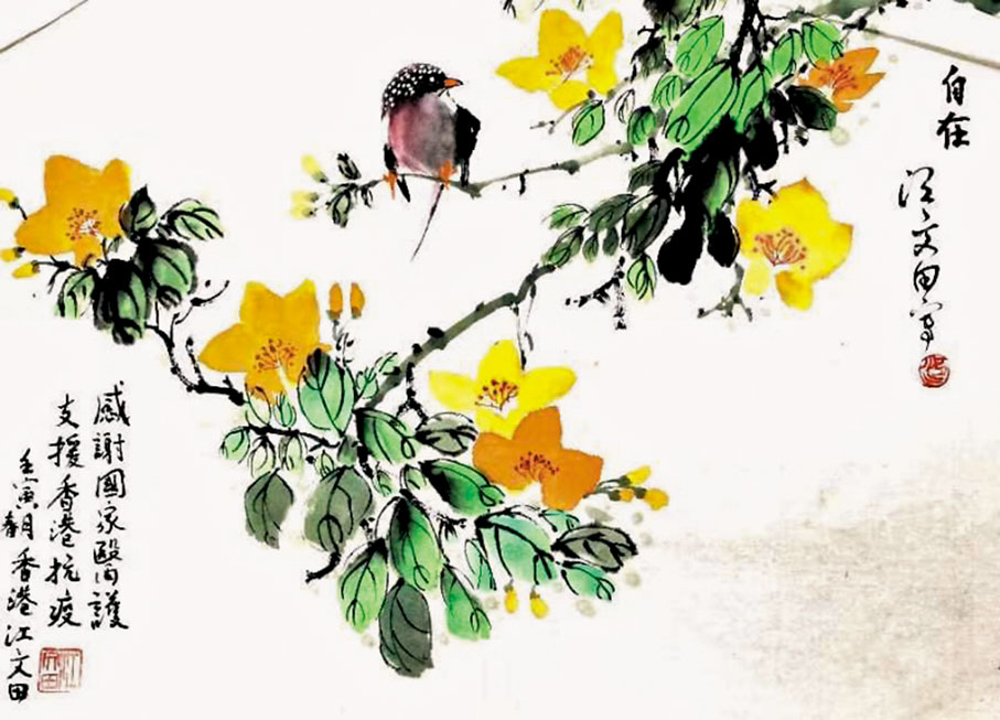 梁君度自己也是今次活動的積極參與者,他一氣創作除了5件書法、15件國畫作品參加徵選,「5幅書法作品寫的都是我的自撰詩,15幅國畫大部分畫的是嶺南紅棉,三四月正值紅棉花開,被稱為英雄花,以英雄花致敬援港抗疫英雄最為合適了。」他認為書法家創作這類作品應寫自撰詩詞,以表達自己的思想感情,如有感於中醫漢藥治療新冠肺炎療效顯著,中央特派出中醫專家來港,並贈送大批中成藥給全港市民。他在自己的書法創作中寫下一首七絕——《讚內地馳援中醫》:百萬同胞疫染身,春愁不盡淚催民。賢能助力急馳港, 漢藥中醫好救人。