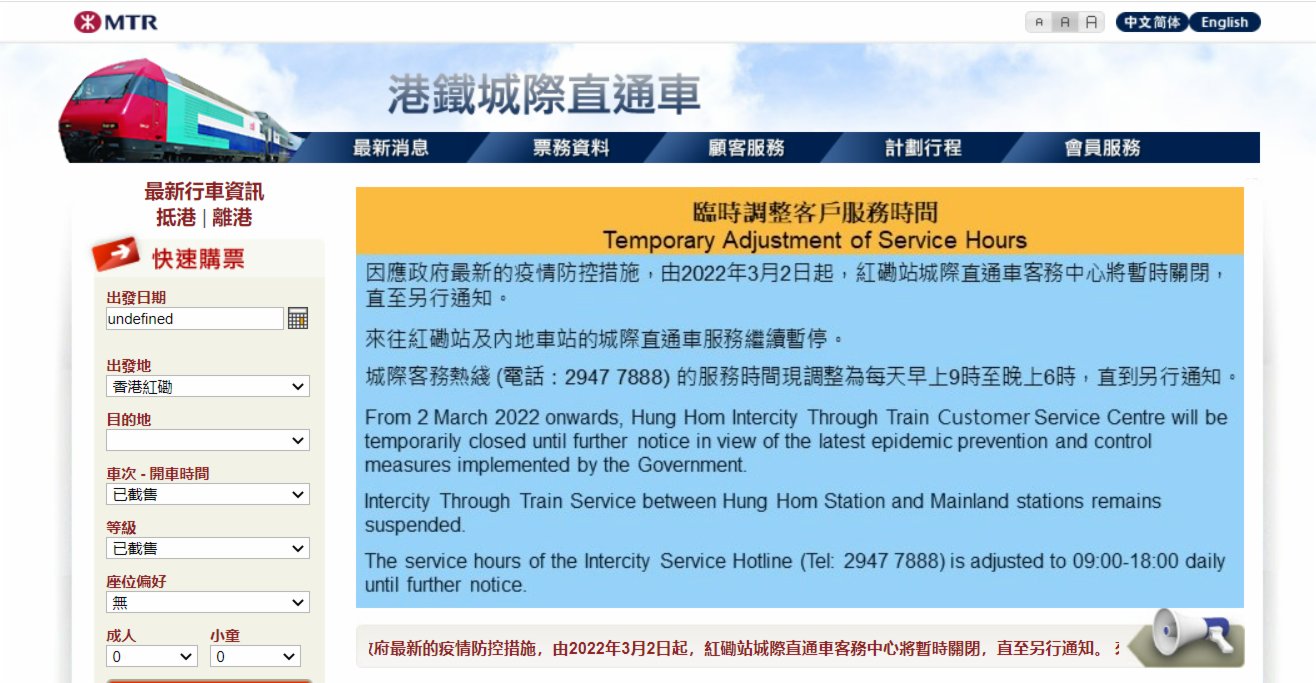 港鐵城際直通車網站公布,因應政府疫情防控措施,由今年3月2日起,紅墈站城際直通車客務中心將暫時關閉,直至另行通知。惟本港近期疫情緩和,該網站仍未有最新消息。