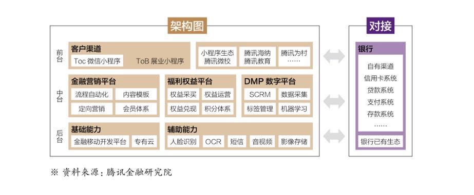 為此,在分析金融科技十大趨勢的同時,《報告》提供了一些解決方案的案例。例如,在助力數字銀行突破時空限制、實現普惠金融管理方面,《報告》指出,由於金融機構APP活躍度低、客戶訴求難以精準滿足,制約着數字化轉型,而小程序是數字銀行最便捷的實現路徑之一。其中,騰訊與國內某大型商業銀行合作,推出數字銀行解決方案,在前台打造To C 小程序和To B 展業小程序等客戶渠道;在中台搭建金融營銷平台、福利權益平台、DMP 數字平台等;在後台注重基礎能力和輔助能力的提升,全面實現與銀行已有生態的對接。