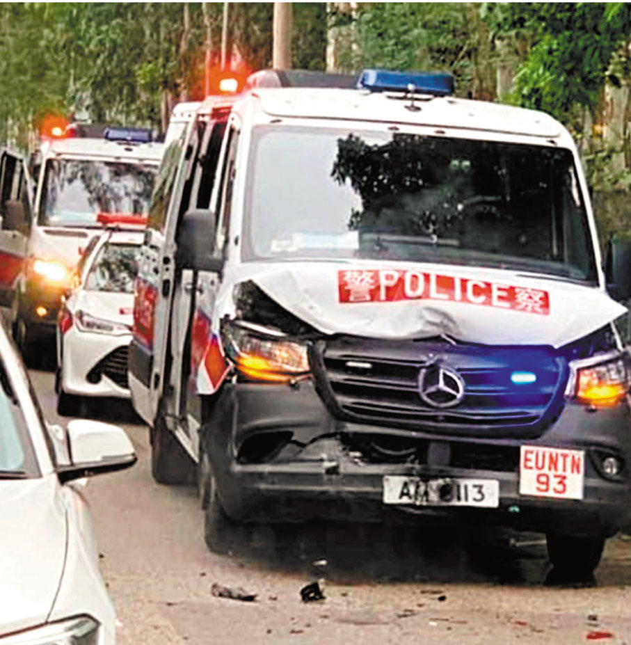 事發昨日下午約3時46分,有交通警員在屯門青山公路新墟對開發現一輛白色私家車違例切雙白線,遂指示其停車接受調查,詎料對方反而加速往元朗方向逃走,警員立即尾隨追截及通知上峰增援。未幾,涉案私家車狂飆至青山公路近潭尾段錦綉花園對開迴旋處,突失控猛撞向一輛平治房車車尾,其間尾隨追至的一輛警方衝鋒車亦收掣不及撞向涉案私家車,警車車頭頓告凹陷及泵把脫落,警員隨即下車將涉案私家車上兩男一女拉出車外制服及拘捕。