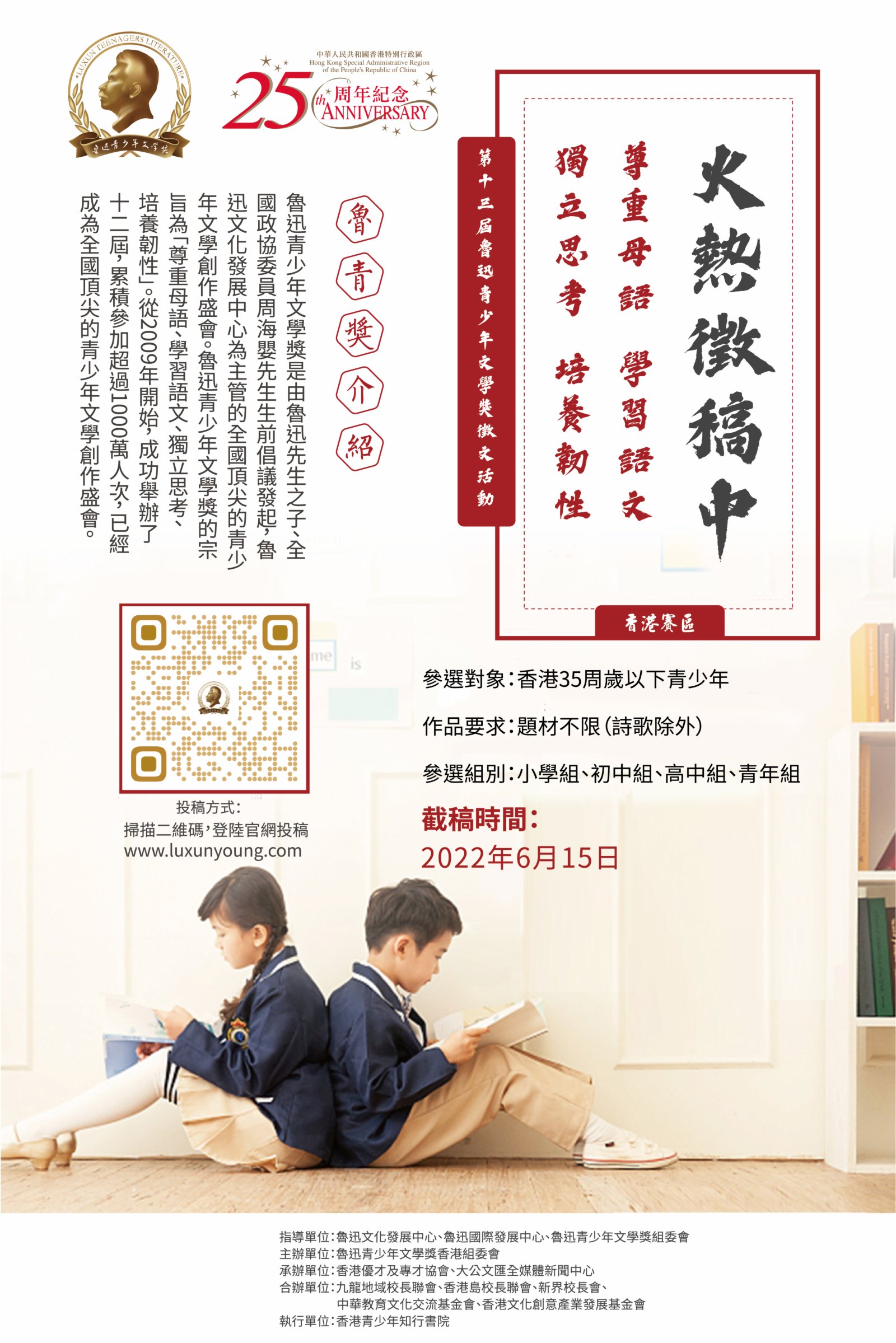 第十三屆魯迅青少年文學獎香港賽區寫作比賽是一項慶祝香港特別行政區成立二十五周年的認可活動,旨在發現並培養優秀的香港青少年文學創作者。魯迅青少年文學獎以「尊重母語、學習語文、獨立思考、培養韌性」為宗旨,是全國頂尖的青少年文學創作評選活動。