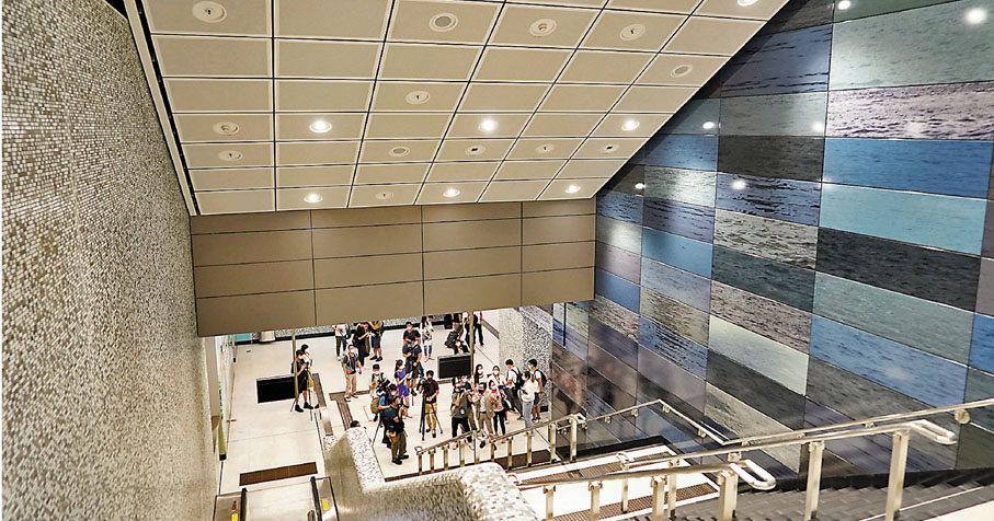2、由本地藝術家梁志和創作的藝術品《水記憶》,將在不同季節、不同時間於車站拍攝的1,200幅海港照片,張貼在向海一面的牆壁上,如將車站置身於海浪、色彩及浮光的微妙變化中,乘客在站內如置身維港中