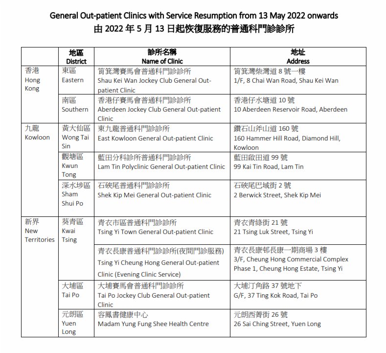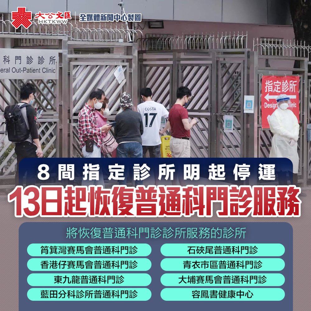 大公文匯全媒體報道:醫院管理局今日(11日)宣布,明日(12日)起轄下8間新冠病毒確診個案指定診所會停止運作,並於5月13日起恢復該8間診所的普通科門診服務,另外青衣長康普通科門診診所亦會於同日起恢復其夜間門診服務。