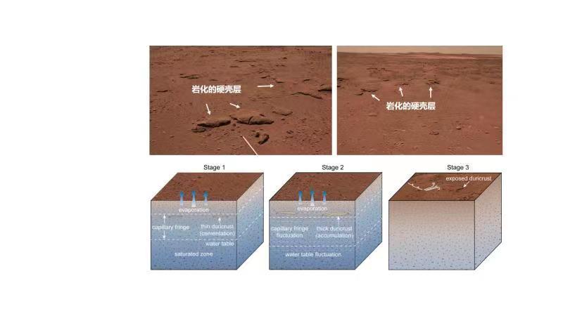 據央視新聞報道,我國天問一號祝融號火星車,在火星烏托邦平原着陸區,通過短波紅外光譜和導航與地形相機數據,發現類似沉積岩的板狀硬殼層,富含含水硫酸鹽等礦物。中國科學院國家空間科學中心空間天氣學國家重點實驗室劉洋研究團隊推斷認為,這可能是由地下水涌溢或者毛細作用蒸發結晶出的鹽類礦物,膠結火星土壤後經岩化作用形成,揭示了着陸區近期有水活動跡象。