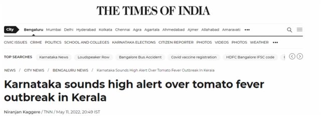 在印度喀拉拉邦爆發「番茄流感」後,卡納塔克邦與喀拉拉邦接壤的地區也發出高度預警。印度報業托拉斯(PTI)說,這種罕見疾病的傳播也讓泰米爾納德邦政府感到擔憂,一個醫療小組正在泰米爾納德邦-喀拉拉邦交界地區,對進入泰米爾納德邦哥印拜陀的人進行發燒、皮疹和其他疾病的檢測。