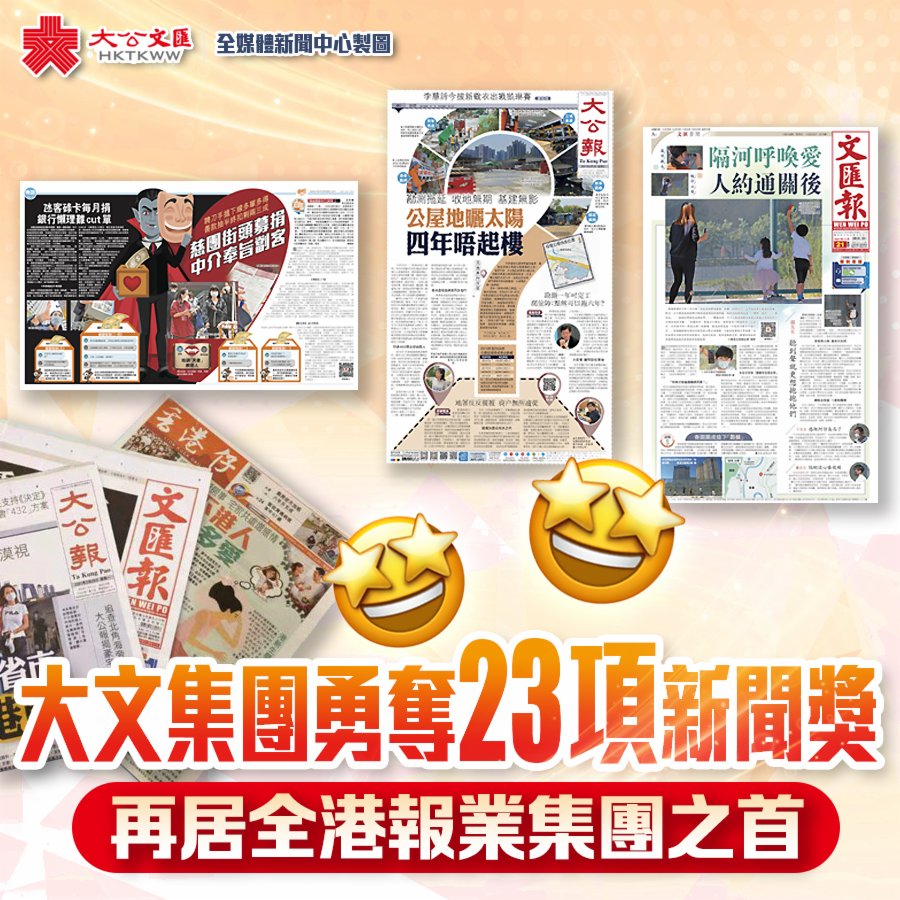 今屆新聞獎,大公文匯傳媒集團在全部17組獎項中的4個組別奪得冠軍。大公報以「覓地建屋反思」系列第二次奪得「最佳獨家新聞」冠軍,以《在槓桿上狂奔 恒大沒有傳奇》連續三年蟬聯「最佳經濟新聞寫作」冠軍,憑「疫區現場直擊」「復活非遺」等系列獲得「最佳新人」冠軍;文匯報以「拆解阿茲海默症」系列奪得「最佳科學新聞報道」冠軍。大公報還以「構建香港智慧城市」系列、《港漂保險經紀的掙扎﹕歸去來兮?》《棺材房坐起撞頭焗「躺平」》等報道,分別獲「最佳經濟新聞報道」亞軍、「最佳經濟新聞寫作」亞軍、「最佳圖片(特寫組) 」季軍等獎項。文匯報還以《隔河呼喚愛 人約通關後》《先煮別家年夜飯 後嚐自家團圓味》《跨境買餸App火爆 食安隱患無王管》等報道,分別獲得「最佳標題」亞季軍、「最佳新人」亞軍等獎項。香港仔報以「食品安全」「吸血籌款中介」等系列,分別獲得「最佳獨家新聞」「最佳新聞版面設計(系列組) 」亞軍等獎項。