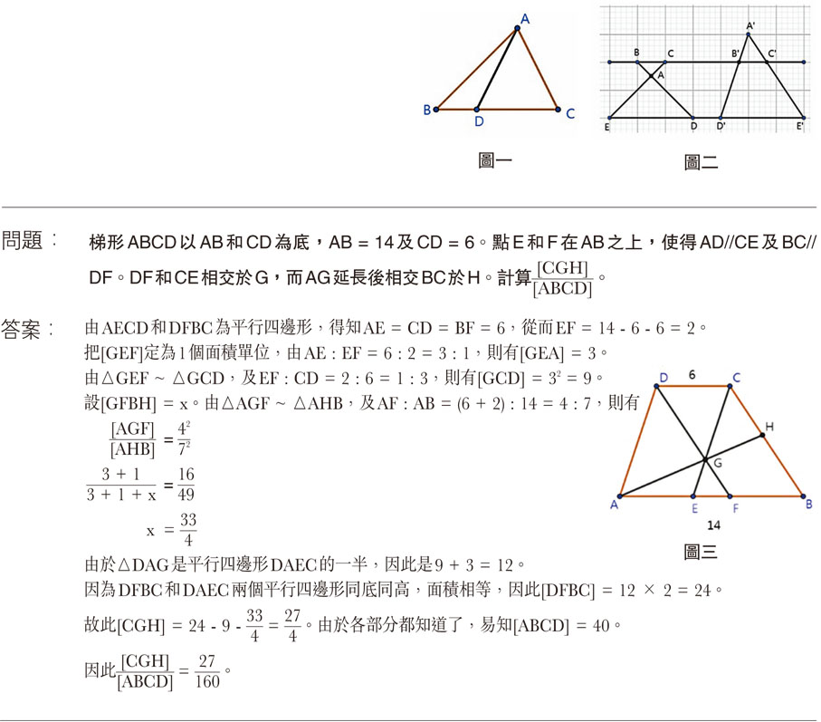 另外,在平行線的情景中,也有些可以用得上面積比的地方。比如在圖二裏,BC'//EE',BD和CE相交於A點時,則有△ABC~△ADE,若BC : DE = 1 : 3,則有[ABC] : [ADE] = 12 : 32 = 1 : 9。右方A'到E'的情況也類似。這裏用上了相似形的面積比的知識,中三左右的課程中會學到,也是文憑試裏常用的技巧。