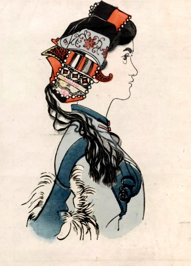 《阿詩瑪像》是組畫的開篇,黃永玉採用側面肖像的方式,展現了主人公阿詩瑪端莊、秀美的形象。頭飾圖案豐富多彩,帶有雲南撒尼人的特點,亮麗的色彩和生動的線條與人物簡約的臉部輪廓形成反差對比。作品畫面優美、詩意盎然,是黃永玉的成名之作。