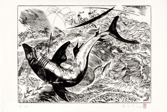 1961年創作的版畫《春潮》是黃永玉的另一力作,從中可見其獨特的線條張力與精神內涵。畫面中,一隻巨大的鯊魚躍出海面,等待它的卻是漁民拋出的長矛。在鯊魚身下,是洶湧激蕩的海潮以及其他大大小小的魚兒。畫面動感奔涌、生機勃勃,在危險與多變的氣息中洋溢着一股生命的力量。