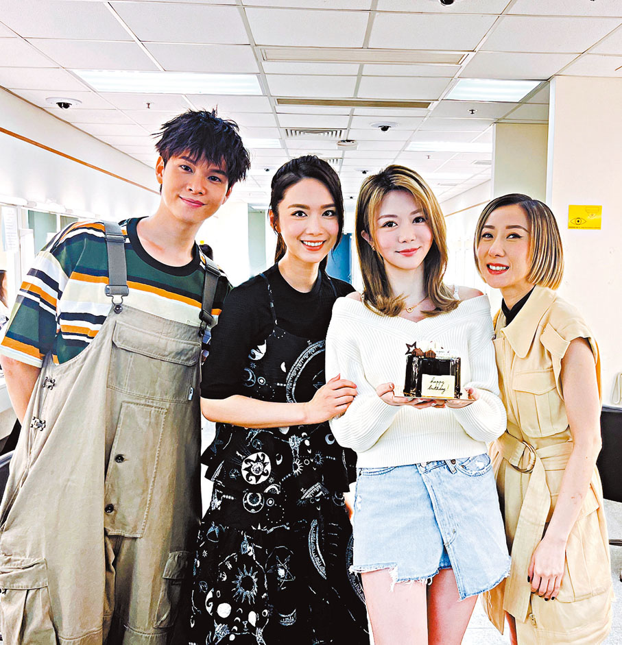 香港文匯報訊(記者 李思穎)英皇歌手曾樂彤於日前(25日)踏入28歲生日,當日她在工作中渡過,跟同公司的泳兒(Vincy)、艾妮(Elly)及小師弟黎展峯(Andy)到電視台錄製節目,眾人非常有心為壽星女送上驚喜。