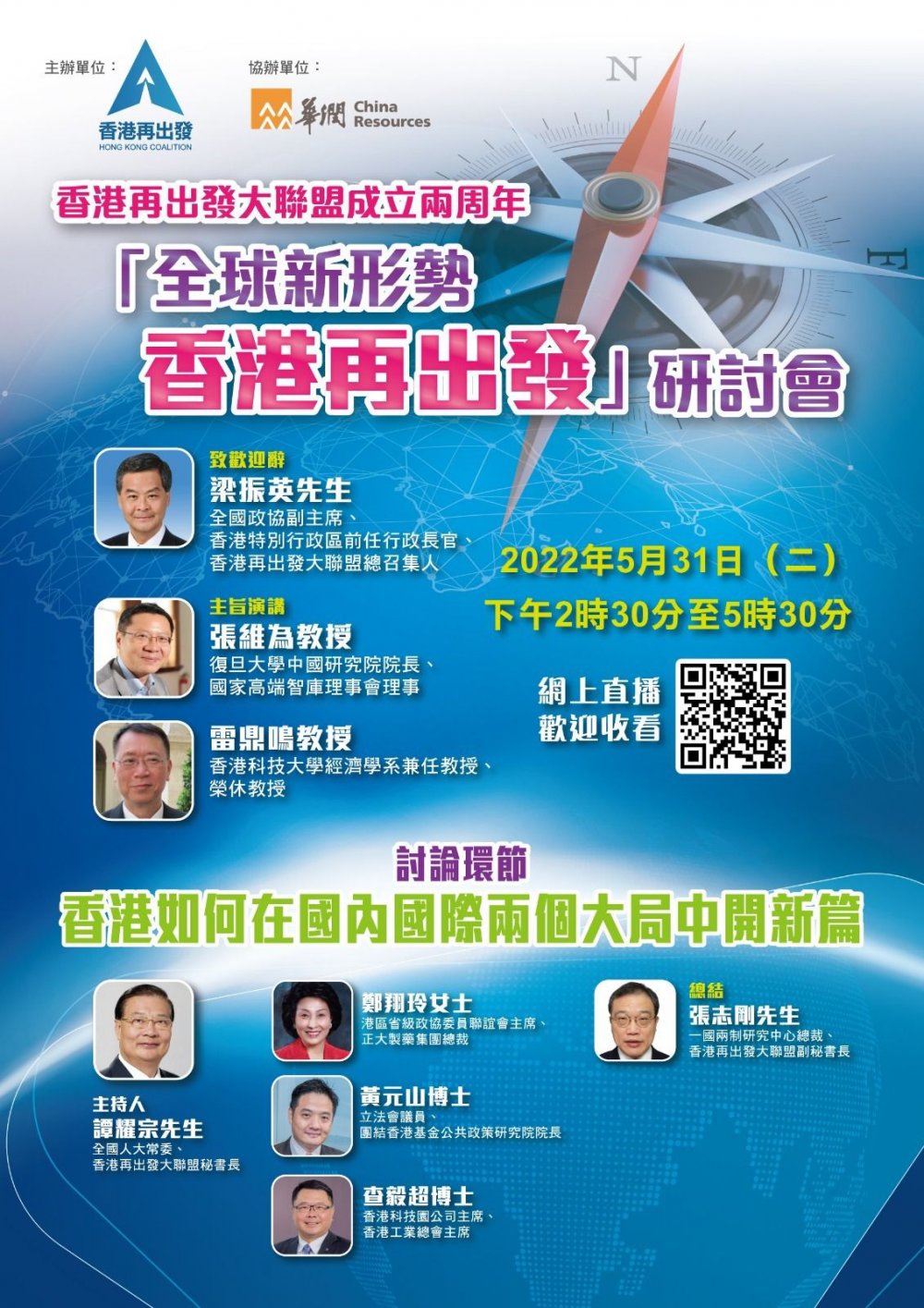 全國政協副主席、香港再出發大聯盟總召集人梁振英將致歡迎辭。復旦大學中國研究院院長、國家高端智庫理事會理事張維為教授和香港科技大學經濟學系兼任教授、榮休教授雷鼎鳴將發表主旨演講,張維為將從國際層面分析議題,而雷鼎鳴將從香港層面分析議題。