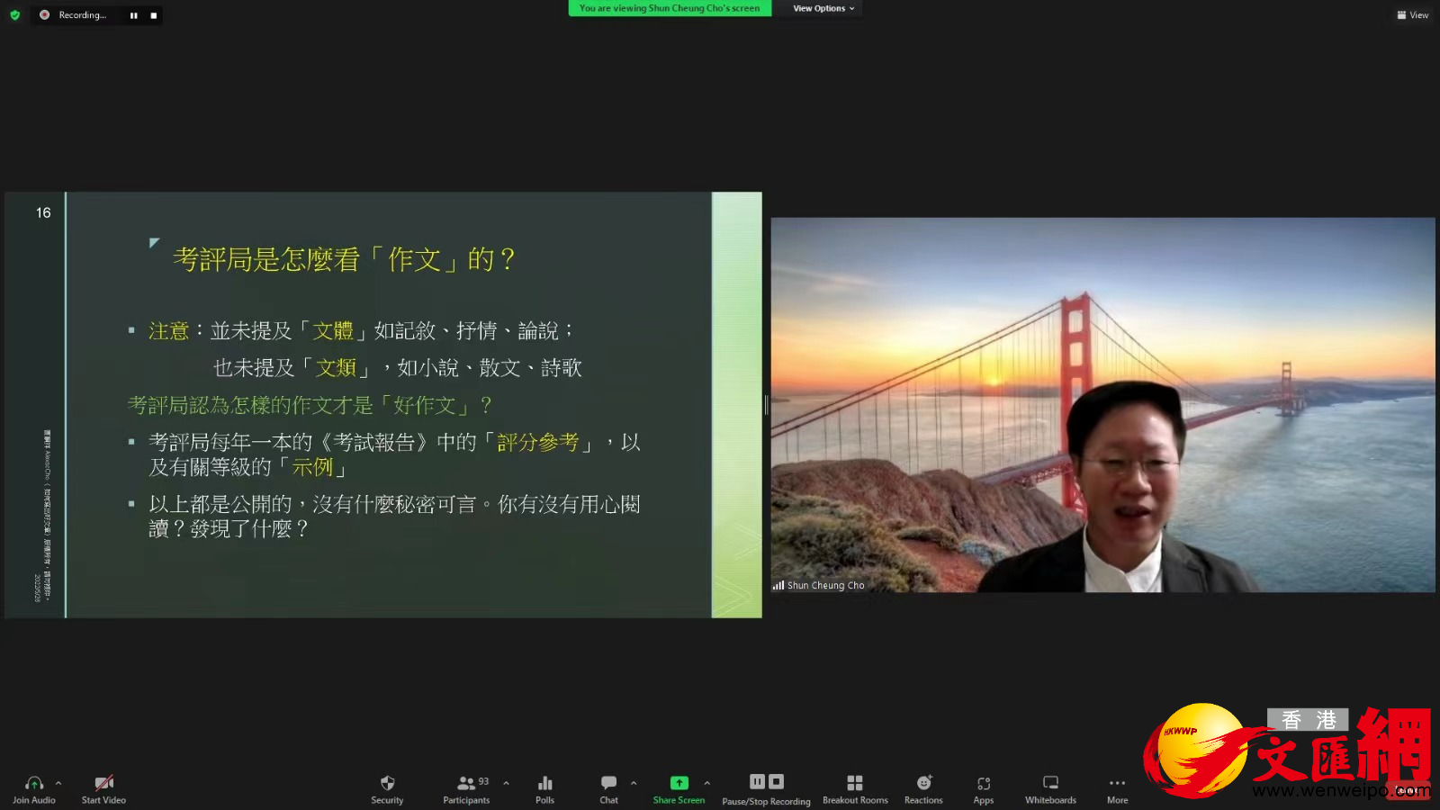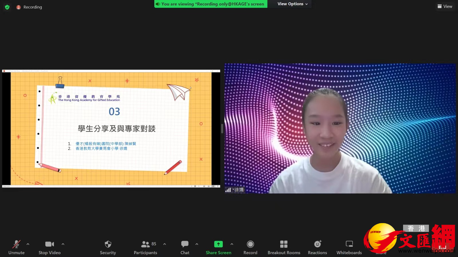 第三環節是「學生分享與專家對談」,由去年獲獎的兩位同學,優才(楊殷有娣)書院(中學部)的陳綽賢及香港教育大學賽馬會小學的徐嬌分享心得。最後是線上學生提問,包括怎樣學好中文、怎樣理解文言文及作答欠準確,以及如何有新的立意等。
