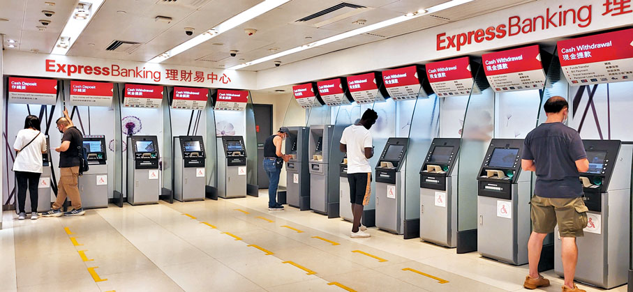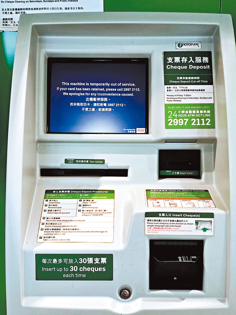 香港文匯報記者昨晨在港鐵黃竹坑站擬使用恒生銀行的櫃員機時,亦見顯示「暫停服務」及「港幣提款服務暫停」等,另有支票機亦顯示「此機暫停服務」。