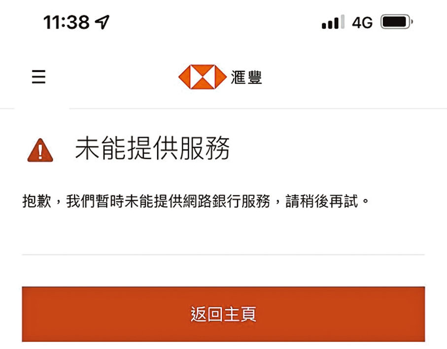 昨晨約11時半起,陸續有市民發現無法使用滙豐銀行及恒生銀行的網上理財及櫃員機服務,並於網上作出討論。有市民指,用滙豐銀行的手機理財App及網上理財時,均顯示「交易指示已被中斷,現正進行系統維修」,其後甚至無法登入。有使用恒生銀行櫃員機的市民則指同樣顯示「暫停服務」或是「未能取回卡」。