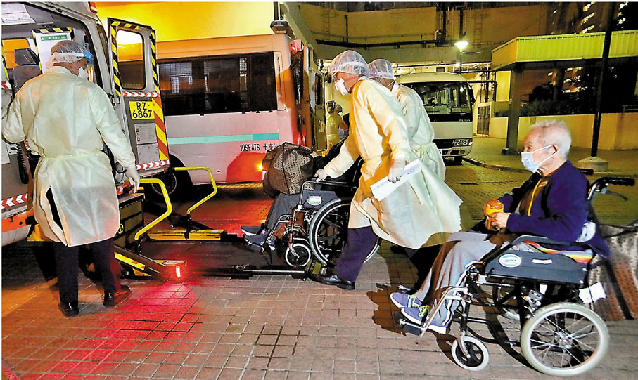 疫情高峰時期,各區的確診長者大幅增加,社署亦增設暫託中心以照顧輪候入院的長者。楊恩健指出,除了院舍撤離行動外,消防處亦同時肩負運送確診長者到暫託中心的行動。自第五波疫情爆發至今,在多次的院舍撤離/送回行動中,2月15日曾試過單日3次相關行動,共涉及127名院友,而在多次行動中,共有18次除了消防處的救護人員外,還動用了消防人員參與。