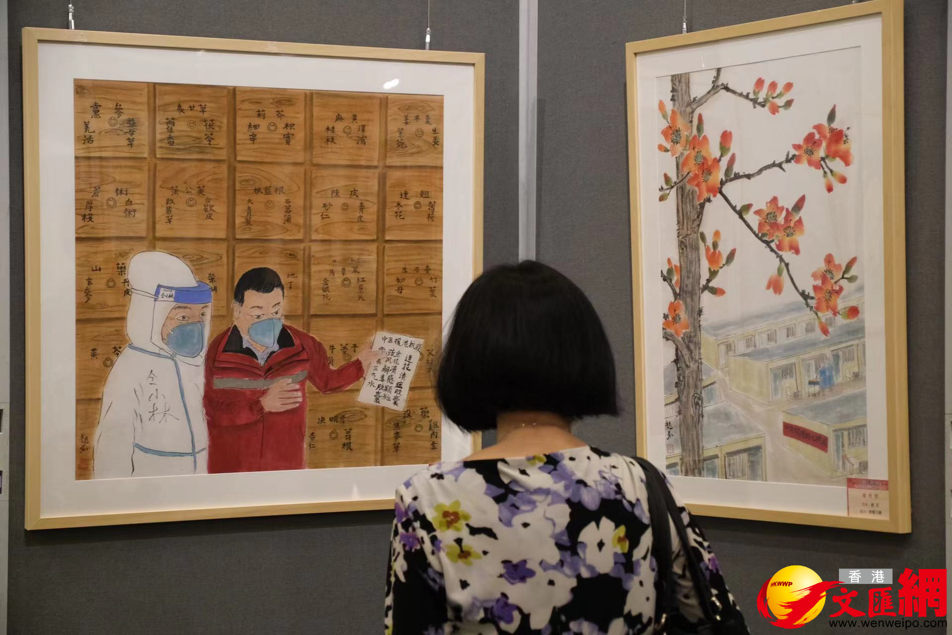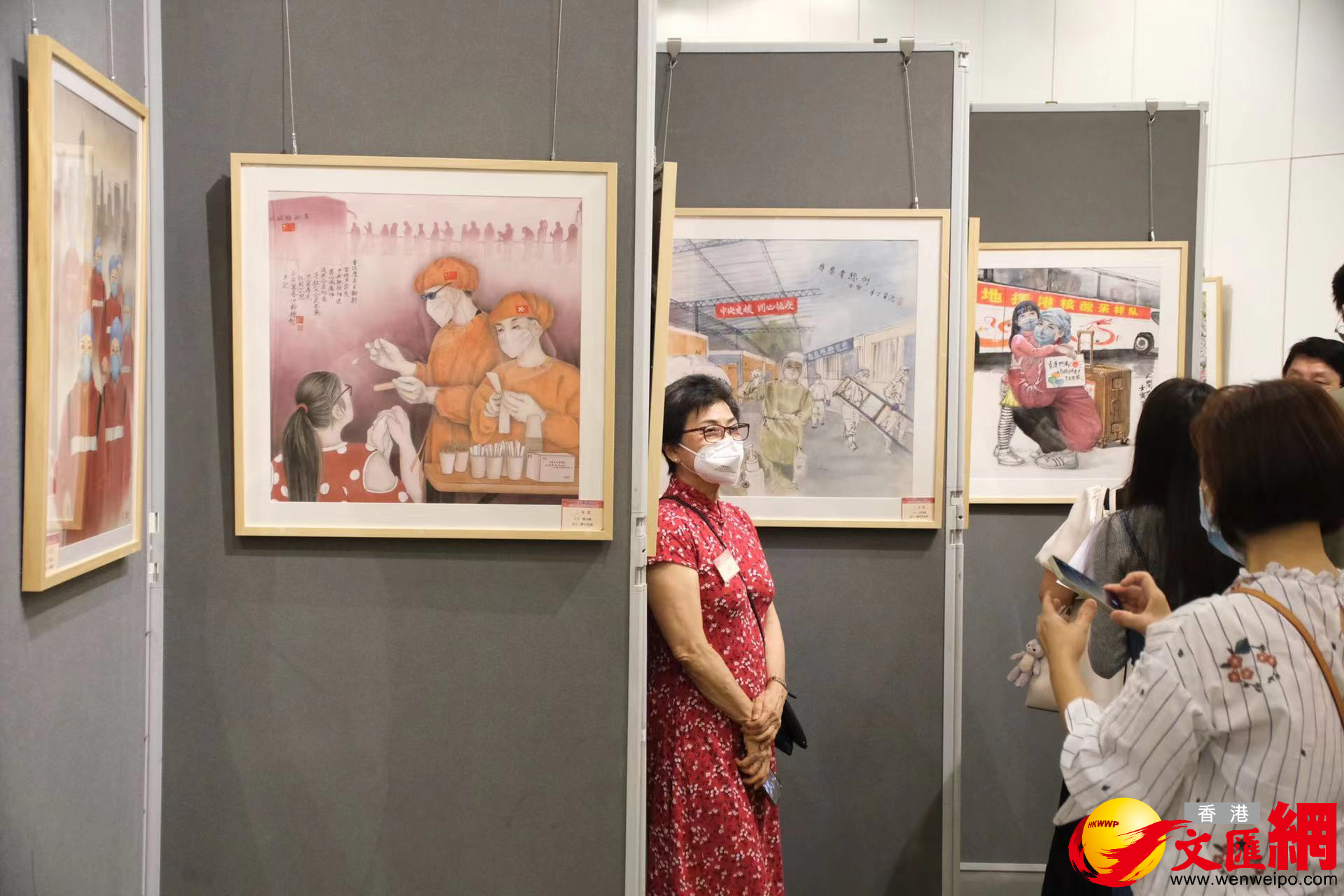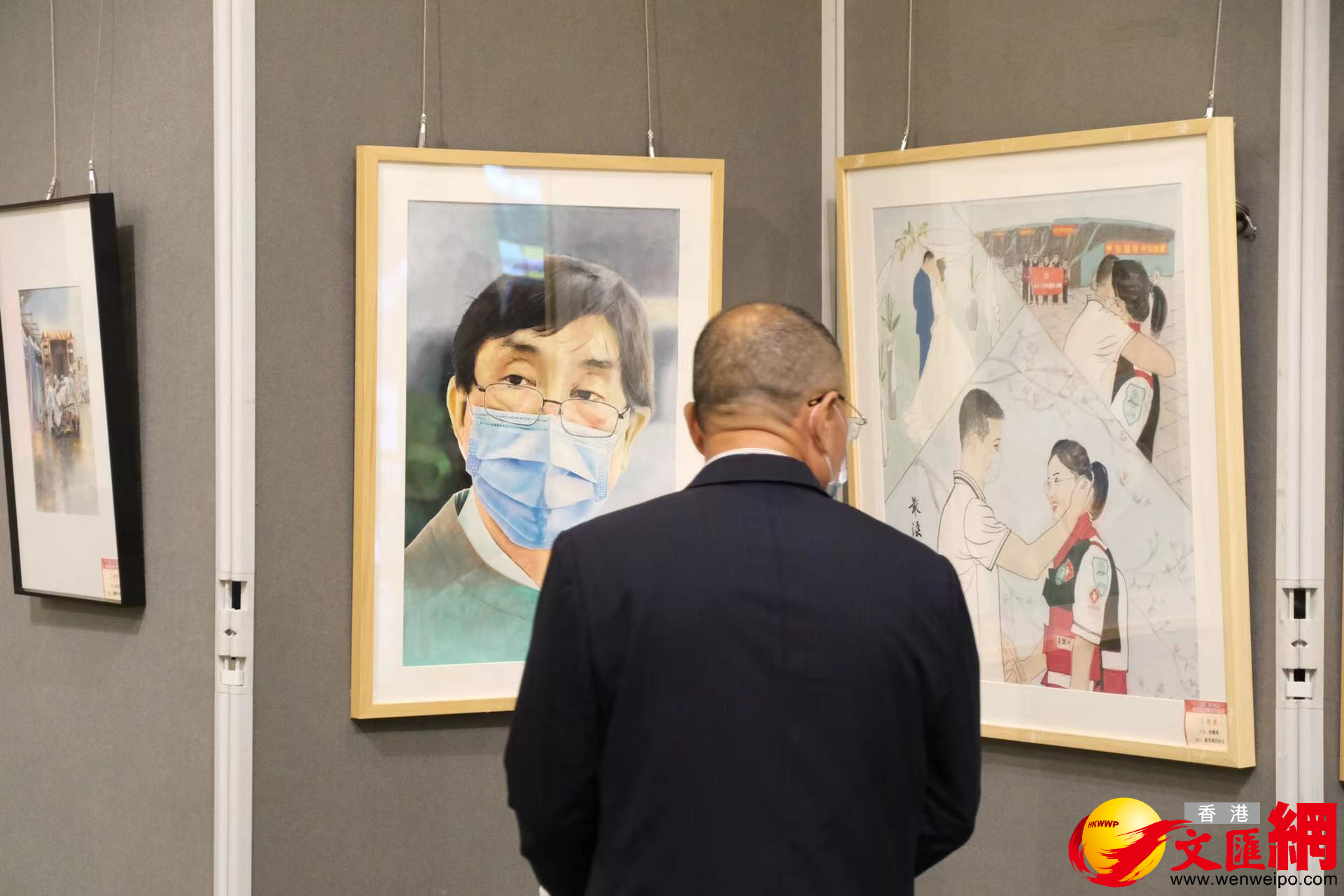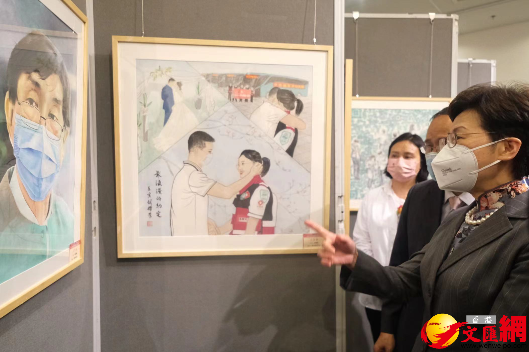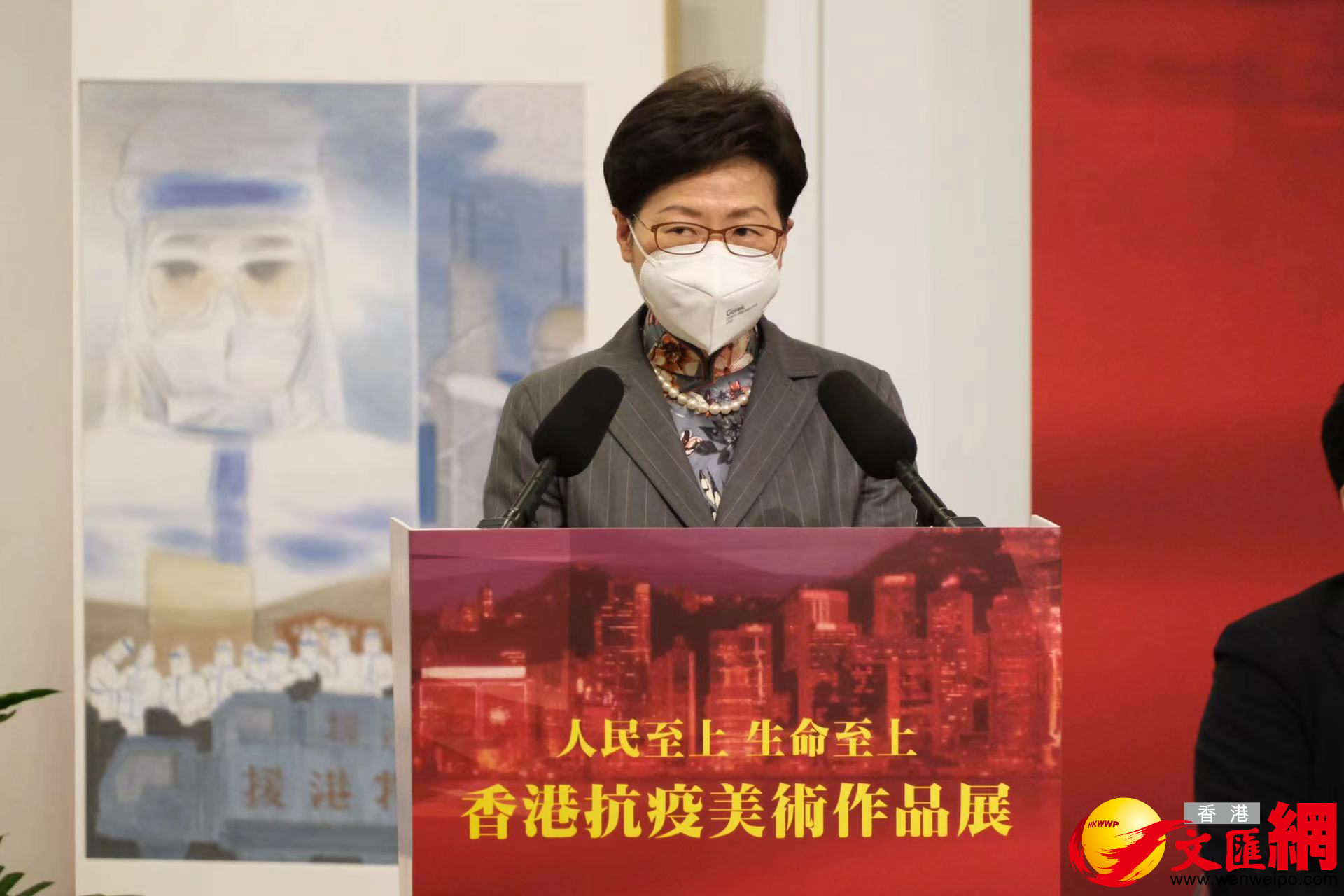 林鄭月娥說,疫症無情,但人間有愛,大家可以看到不少作品描繪疫情下香港面對的重重陰霾,但亦可欣賞到很多作品刻畫出香港人眾志成城、守望相助的感人情景。超過400幅抗疫作品已經在多個網絡媒體的在線作品展中分批亮相,當中150幅優秀作品在實體展覽展出,讓香港市民能夠近距離欣賞這些極具意義的藝術作品。