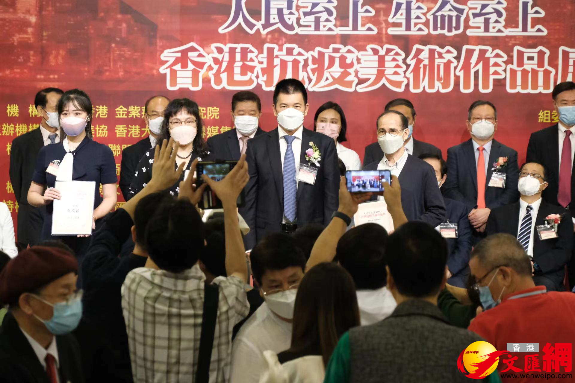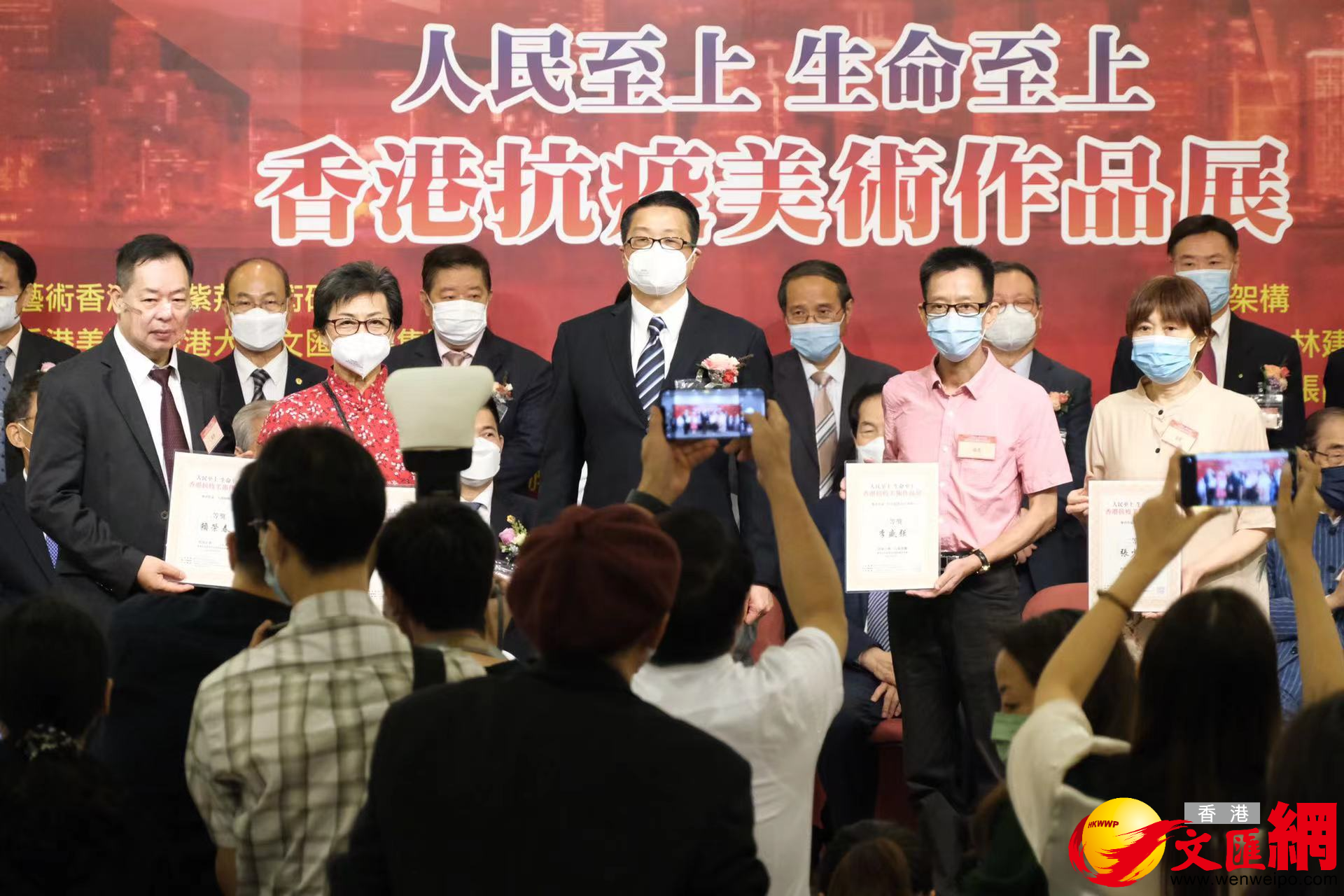 大公文匯全媒體報道:由藝術香港、金紫荊藝術研究院、香港美協、香港大公文匯傳媒集團等機構聯合主辦的「人民至上 生命至上──香港抗疫美術作品展」頒獎典禮今日(6日)舉行,行政長官林鄭月娥在致辭時表示,展覽作品題材廣泛多樣,以不同形式、維度及視野,展現香港在抗擊新冠疫情過程中的方方面面,包括疫情下的民生百態、醫護人員無畏無私抗擊疫情、社會各界攜手面對挑戰,以至中央源源不絕的援港措施等。