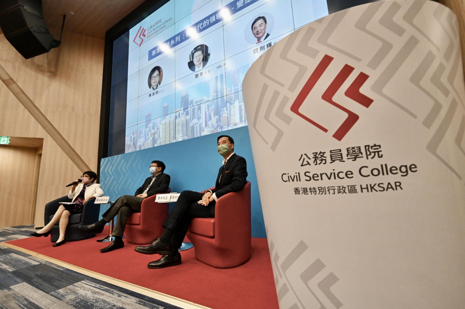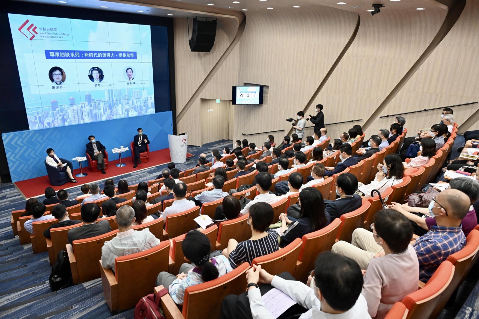 今日的座談會由資深傳媒人陳淑薇擔任主持,講者包括香港大學政治與公共行政學系客席教授、前申訴專員黎年和社區投資共享基金委員會主席關則輝。講者們分享了如何帶領機構及團隊適應變化及向前邁進,以及危機管理的心得,並與學員對談,互相交流。座談會在學院位於北角政府合署的院址進行,共約100名首長級和高級公務員出席。