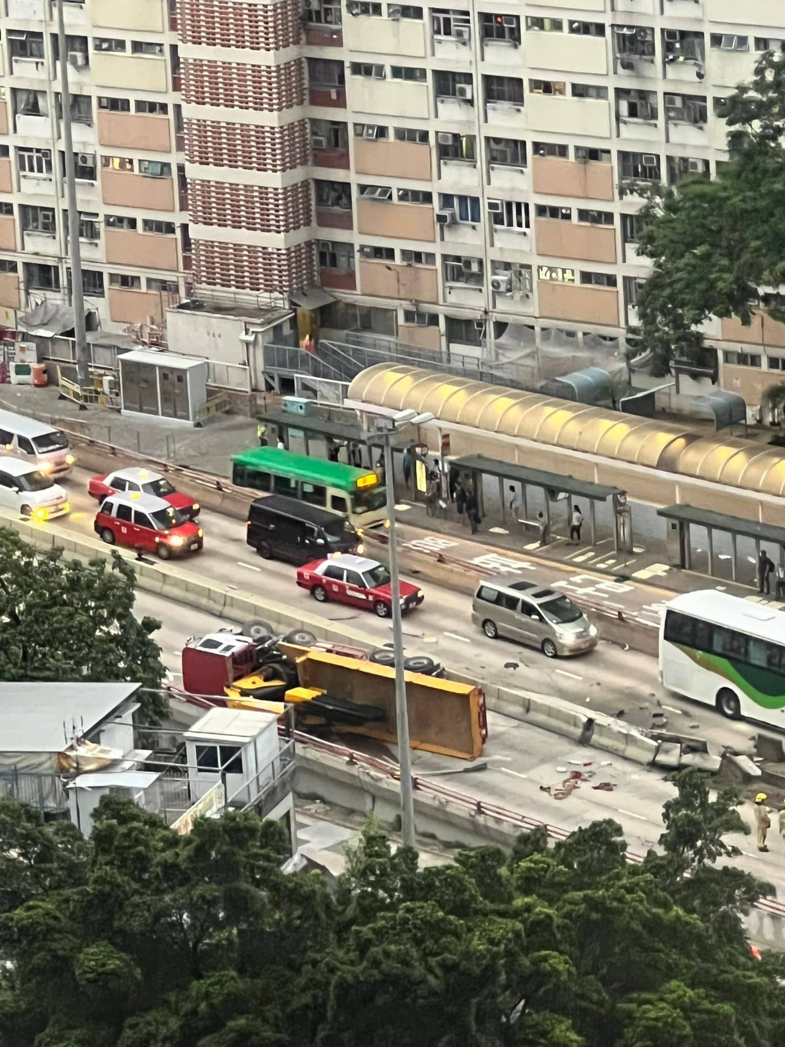 大公文匯全媒體報道:黃大仙發生翻車意外。今日(14日)清晨5時許,一輛重型吊臂車沿龍翔道東行。途至近彩虹邨對開時,突然失控撞向路中石壆,繼而向左翻側。男司機輕微擦傷,自行爬出車廂,毋須送院。惟吊臂車橫臥路中,數米石壆被撞至粉碎,四散一地,交通嚴重受阻。