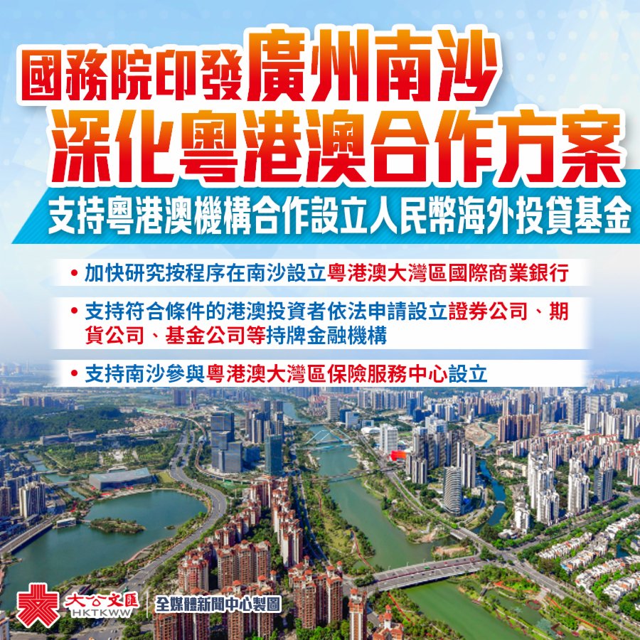 為加快推動廣州南沙深化粵港澳全面合作,打造成為立足灣區、協同港澳、面向世界的重大戰略性平台,在粵港澳大灣區建設中更好發揮引領帶動作用,國務院近日制定廣州南沙深化面向世界的粵港澳全面合作總體方案。方案將南沙打造成為香港、澳門更好融入國家發展大局的重要載體和有力支撐。